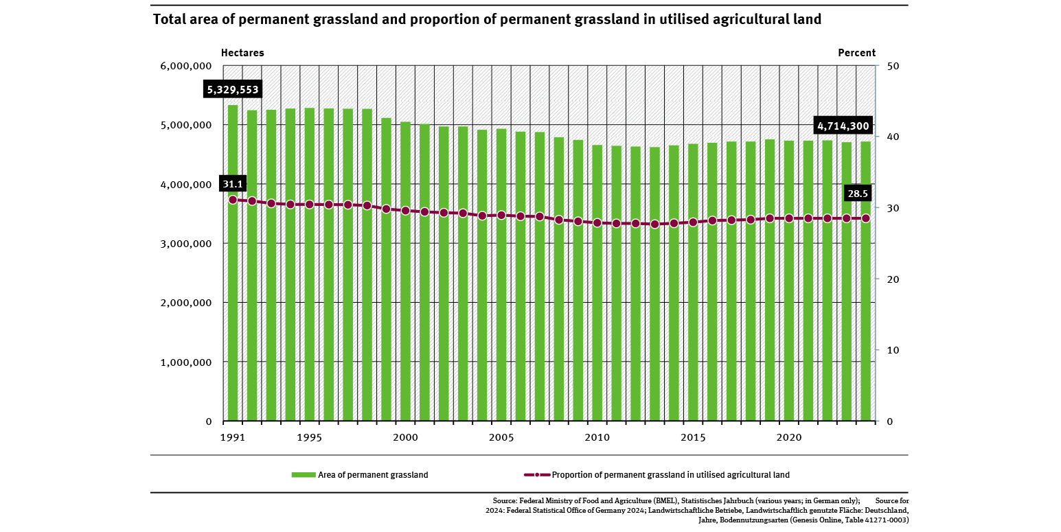 Permanent grassland in Germany has been under pressure in recent decades. In 1991 there were still over 5.3 million hectares (m ha) of utilised agricultural land managed as permanent grassland. By 2024, the total area of permanent grassland had declined by 12 % to around 4.7 m ha.