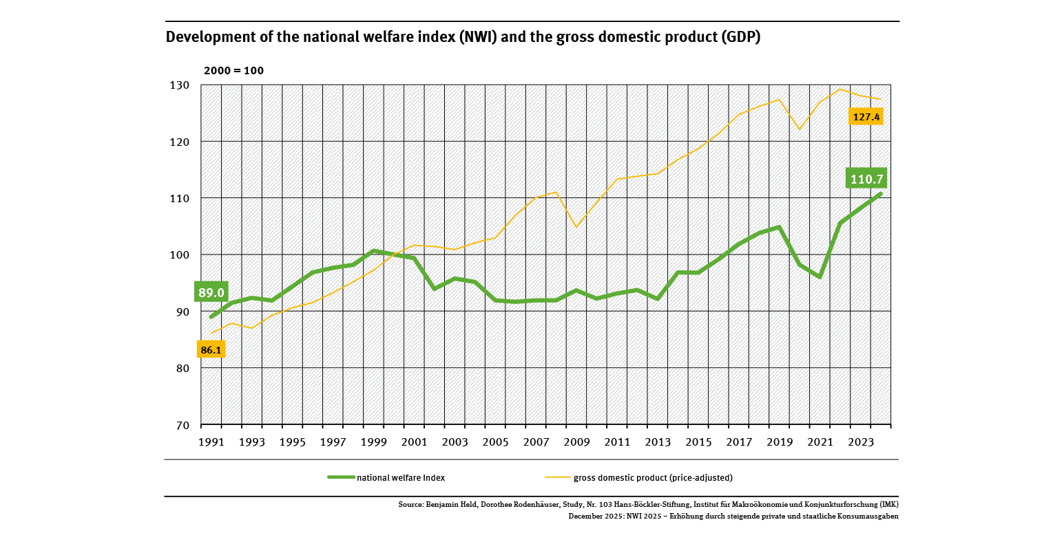 The NWI increased in 2023 and 2024. There was a further decrease in pollution, mainly due to falling energy consumption and the expansion of renewable energy and the associated lower emissions. There was also a slight increase in consumption. Early estimates based on developments in the first half of the year suggest a similar trend in 2025. A further increase of the NWI in 2025 will therefore probably occur. You will find more information in a recent detailed analysis of the NWI (in German only) .