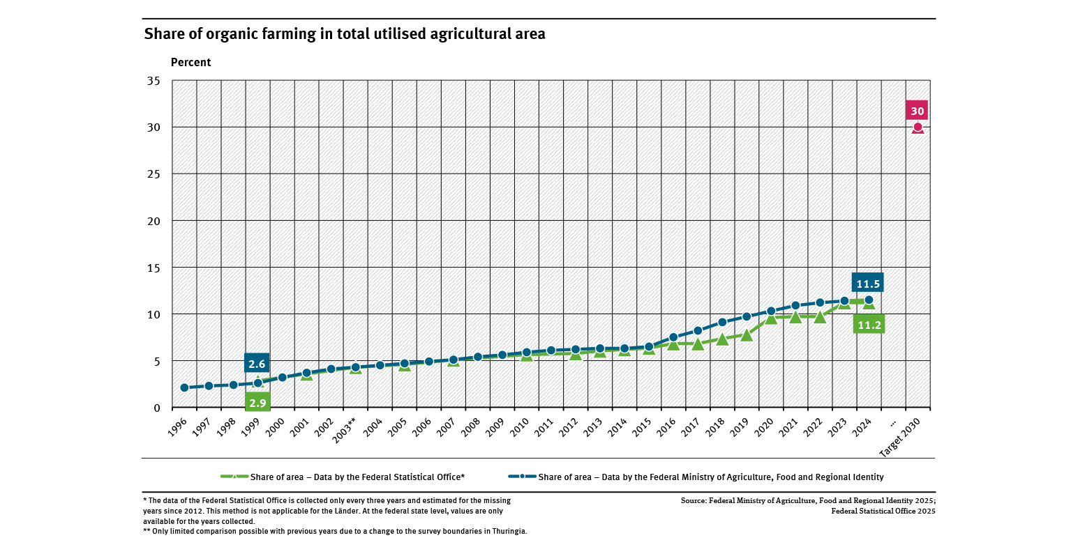 The German Federal Statistical Office uses various surveys (including the Agrarstrukturerhebung, Bodennutzungshaupterhebung) to determine the area that is organically farmed. The survey covers organically farmed areas of farms larger than five hectares that are subject to the control procedure of the EU legislation. The reference used to calculate the area share is the agriculturally used area (again from five hectares upwards). A slightly different data set is used by the BMLEH. The indicator covers areas that are managed in accordance with the European Eco-Basis Regulation and are reported to federal state authorities. Small enterprises below a size of five hectares are also included. For the calculation of the share, however, these are related to the total agricultural area (five hectares or more). For methodological reasons, the data of the BMLEH therefore show a higher proportion of organically farmed area. The area shares of organically managed land based on BMLEH statistics shows a slight increase to 11.5 % for 2024. From 2026 onwards, only data collected by the German Federal Statistical Office will be used. At the same time, the data basis for organic farming is to be improved from 2026 onwards by amending the German Agrarstatistikgesetz (Agricultural Statistics Act).