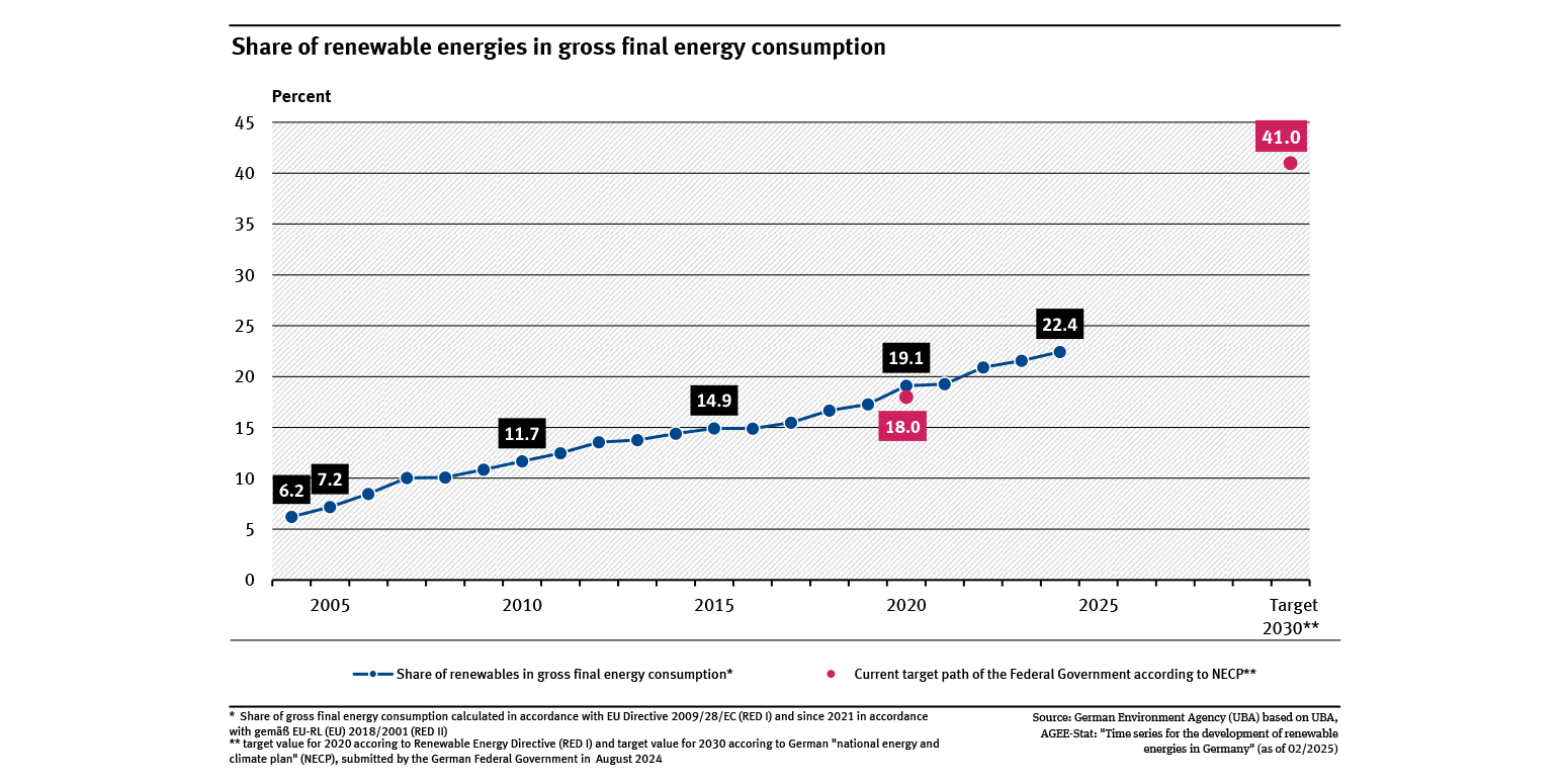 With the update of the National Energy and Climate Plan (NECP) 2024, Germany has committed to increase the share of renewable energies to 41 % by 2030. Previously, the target was 30%, but was raised as part of the EU's recently revised Renewable Energy Directive (RED). Across the EU, the share of renewables in gross final energy consumption is targeted to rise to between 42.5 and 45 % by 2030. This means that all EU countries will have to achieve similarly ambitious targets as Germany, depending on their starting position. However, development in Germany is not yet on track. In order to achieve the target, the uptake of renewable energies must be significantly accelerated.