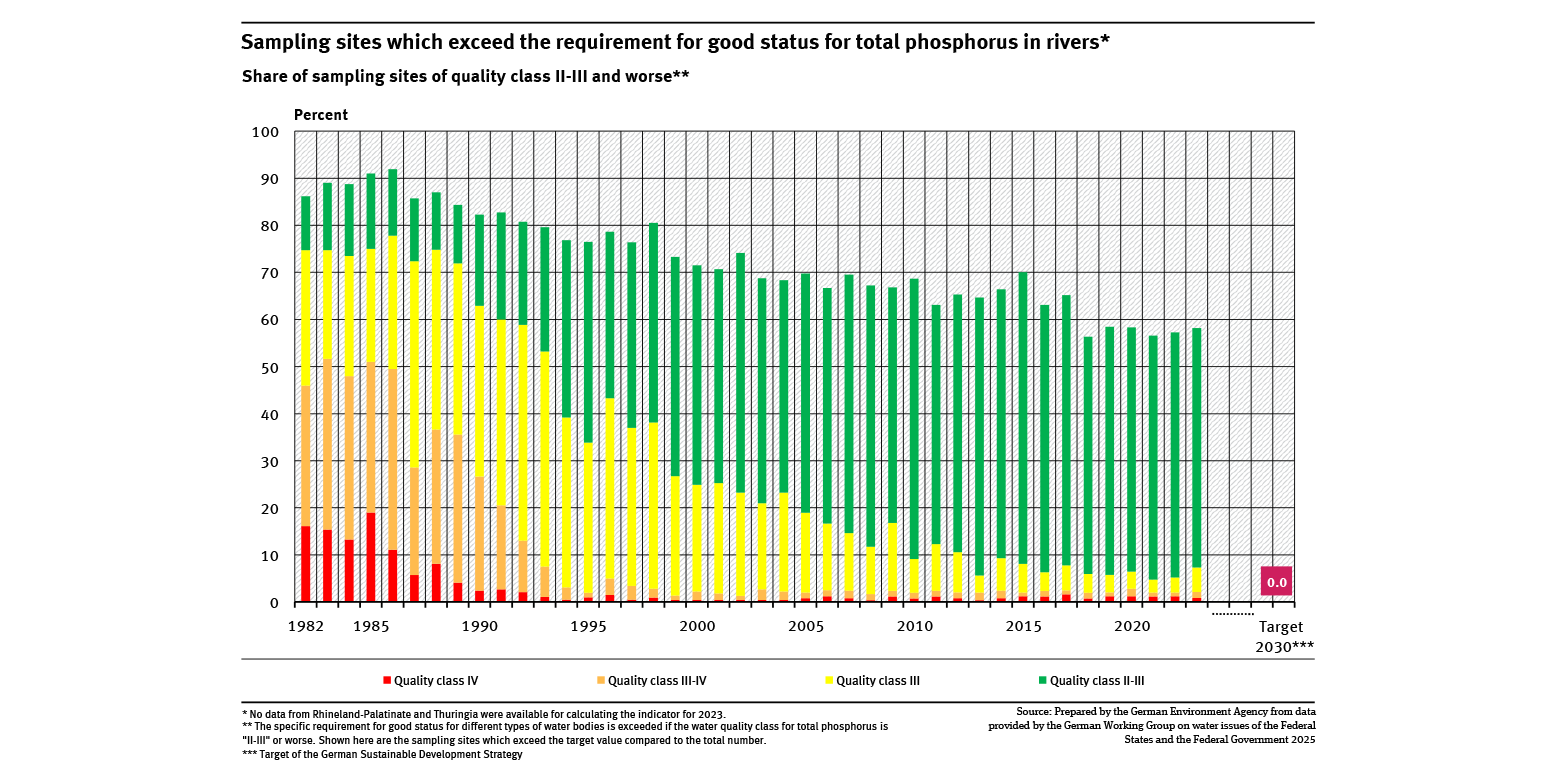 In the early 1980s, excessive phosphorus concentrations were measured at almost 90 % of sampling sites. Since 2018 this share has remained slightly below 60 %. However, if the poorer quality classes are considered, then a further improvement can be seen. Overall, the share of sampling sites where the requirement for phosphorus was exceeded has decreased. This improvement is mainly the result of introducing phosphate-free washing powders and phosphate precipitation in the larger sewage treatment plants.