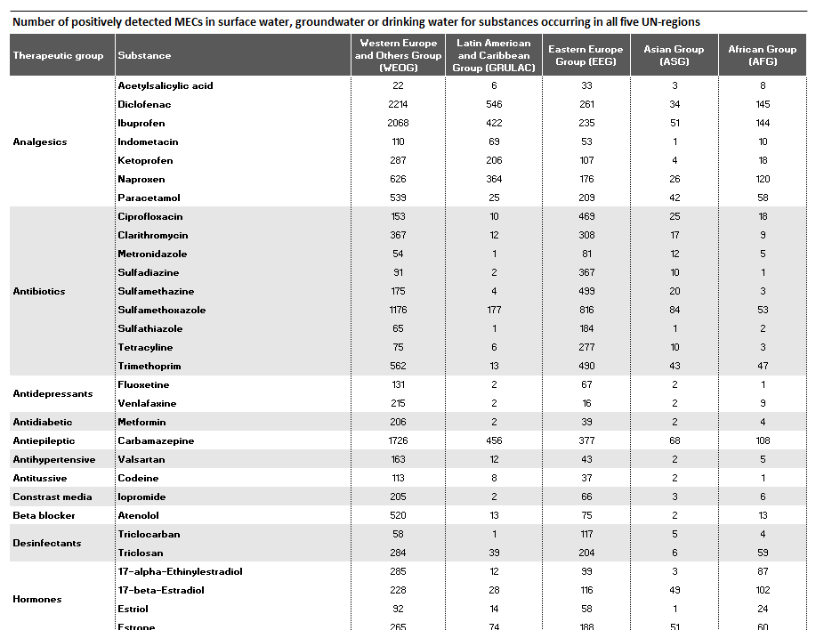 For the database 2,062 publications were comprehensively reviewed and analysed. Environmental concentrations of human and veterinary pharmaceutical residues could be collected for 61 matrices. Most pharmaceutical residues were found in surface water, groundwater, tap/drinking water as well as in soil and sediment.