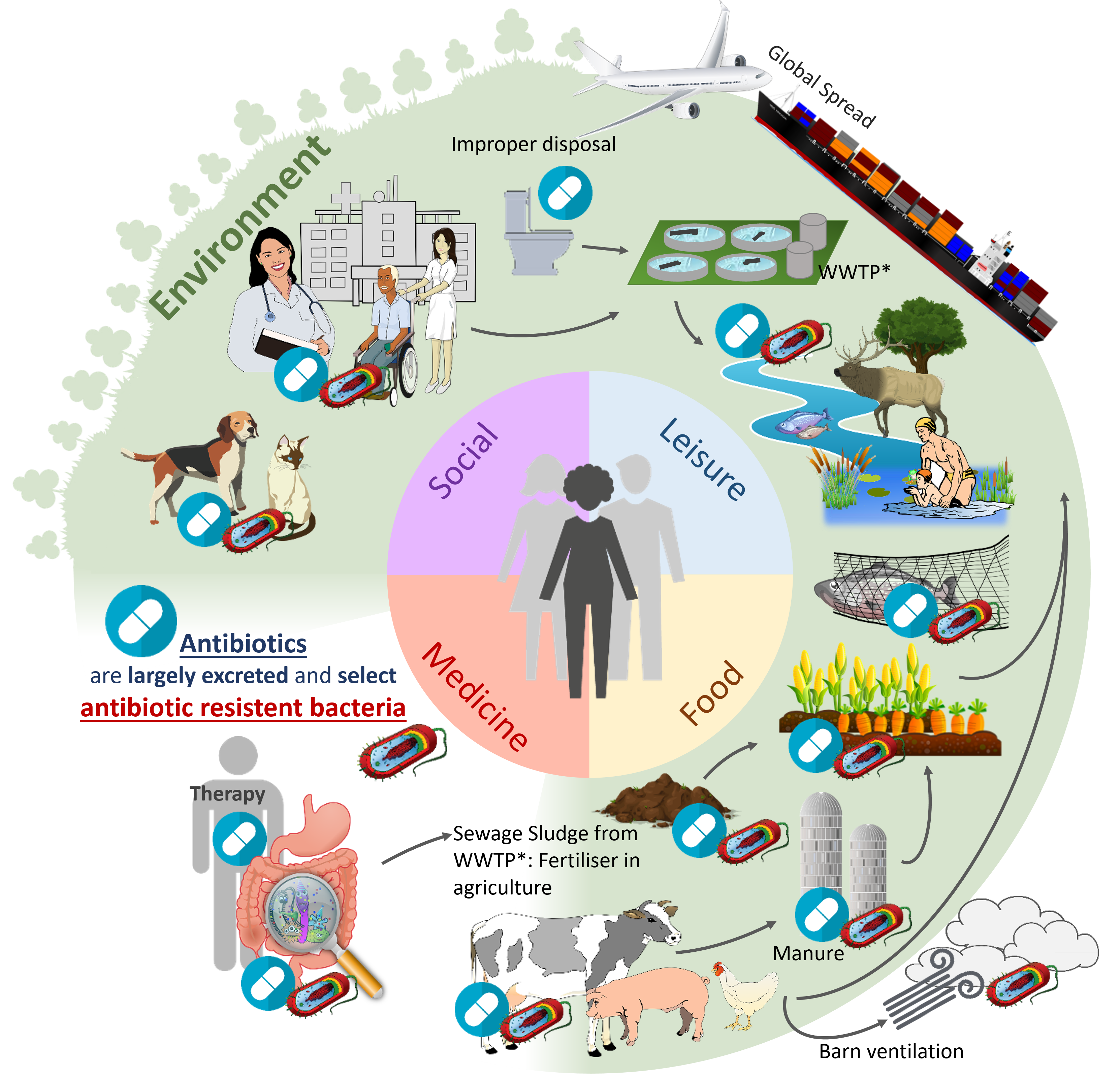 Antibiotic residues are released into the environment through their use in human and veterinary medicine. This promotes the selection, development and spread of antibiotic resistance in bacteria. The environment is therefore a reservoir for antibiotic resistance. Humans can come into contact with antibiotic resistance in all areas of life (modified after Schröder et al. 2020)