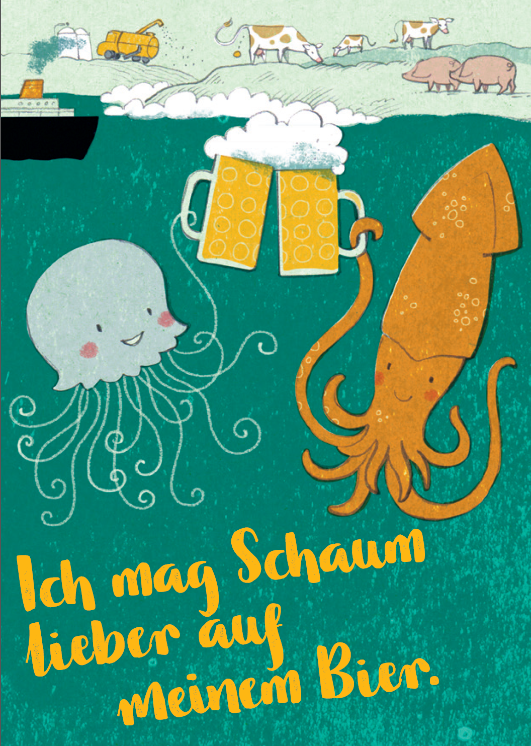 2 sea creatures toast each other underwater with beer