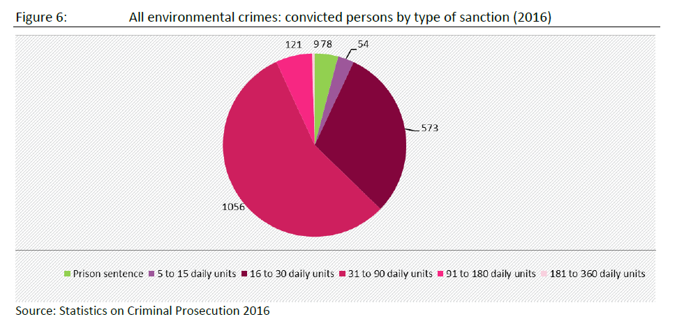The pie chart shows that of those convicted for environmental crimes in 2016, 78 received prison sentences and 1,813 fines. Of the fines, 60% were between 31 and 90 daily rates; 32% were between 16 and 30 daily rates.