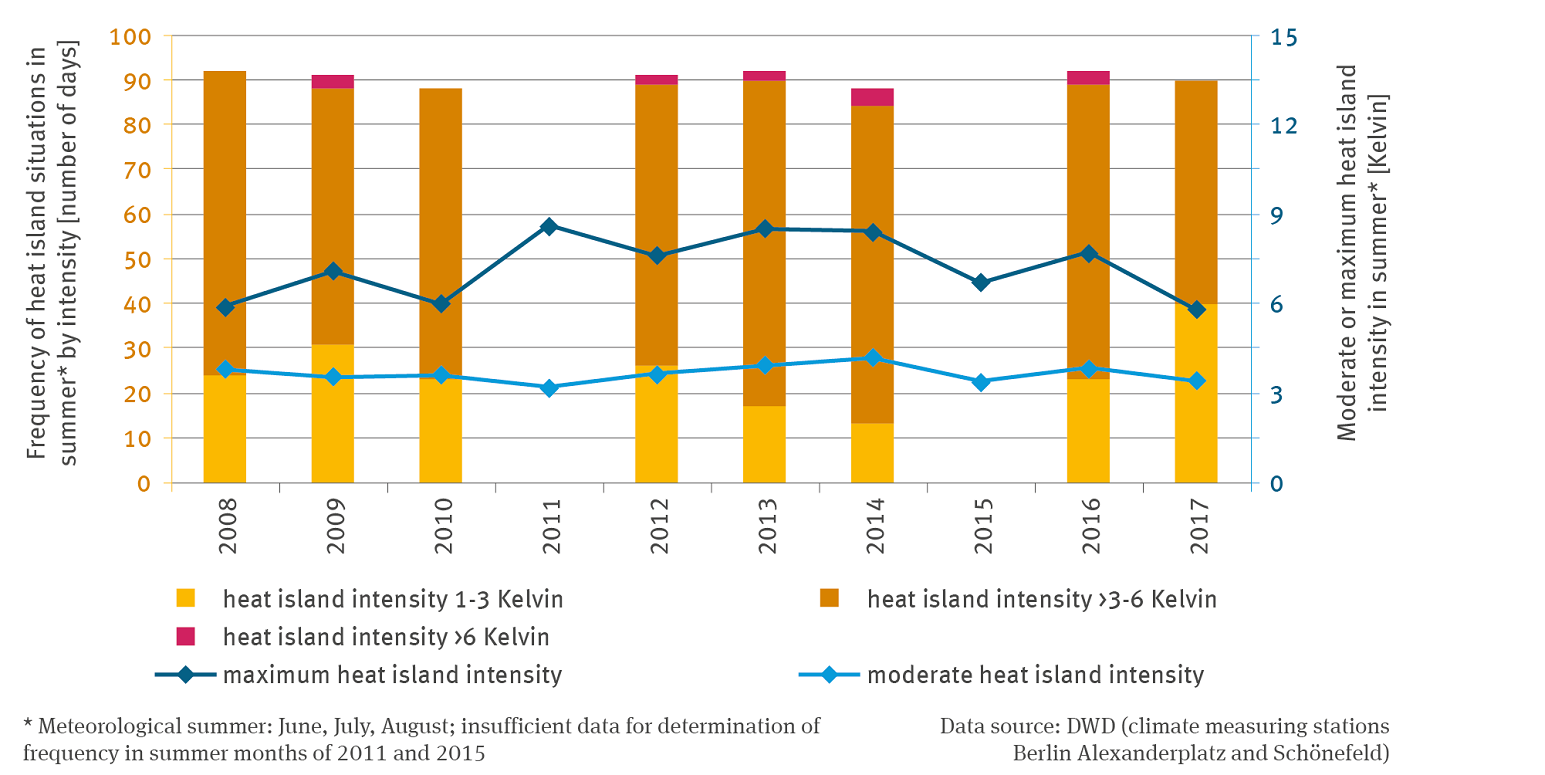 In addition, a line for the maximum heat island intensity and a line for the medium heat island intensity are shown for all years. A clear development is not discernible. No trend analysis was carried out.