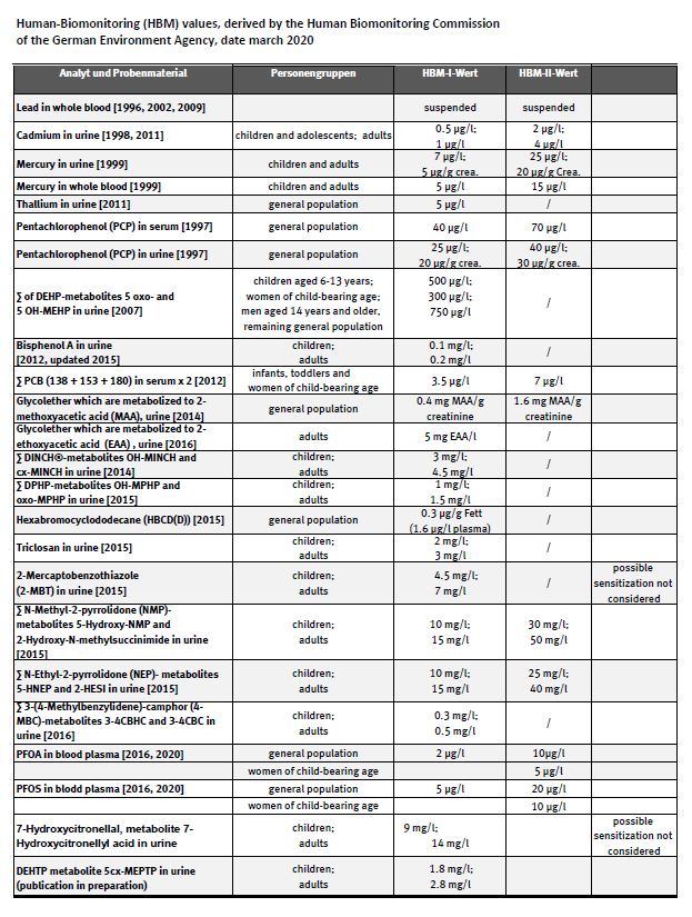 Current Human Biomonitoring (HBM) values for blood and/or urine