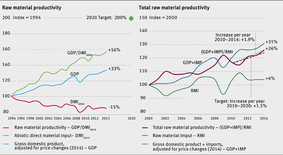 Development of raw material productivity and total raw material productivity n Germany