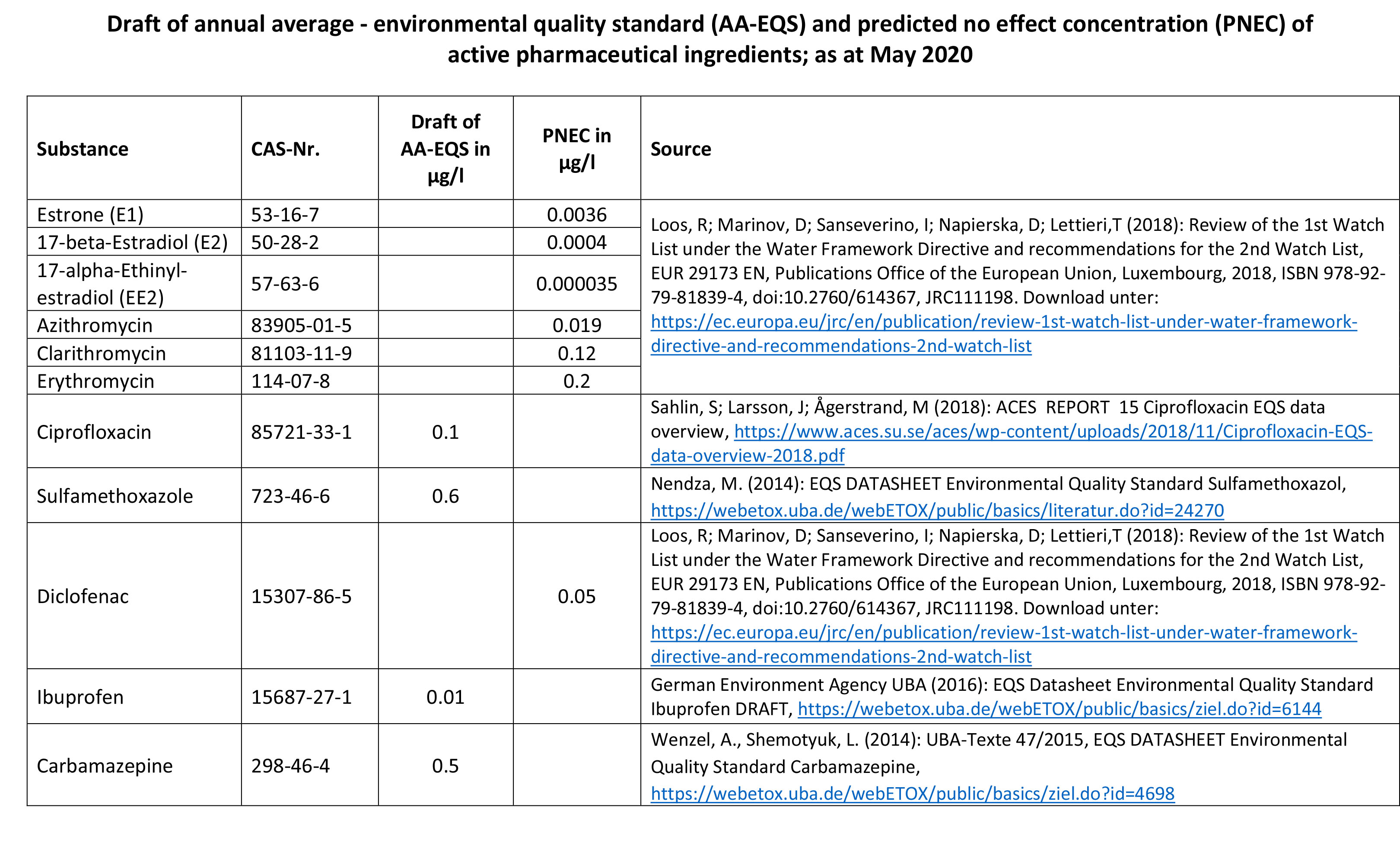 Draft of annual average - environmental quality standard (AA-EQS) and predicted no effect concentration (PNEC) of active pharmaceutical ingredients; as at May 2020