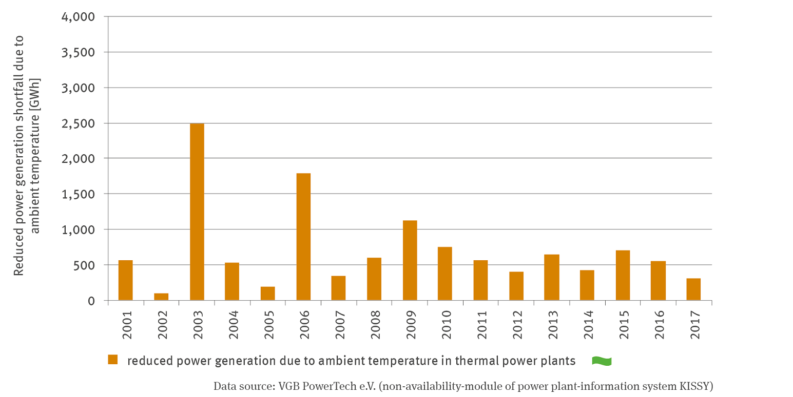 A bar chart shows the ambient temperature-related electricity production of thermal power plants in gigawatt hours in a time series from 2001 to 2017. The values fluctuate between less than 100 gigawatt hours for 2002 and 2,500 gigawatt hours for 2003. From 2007 onwards, the values become comparable and range between 300 and 1,000 gigawatt hours. There is no trend so far.