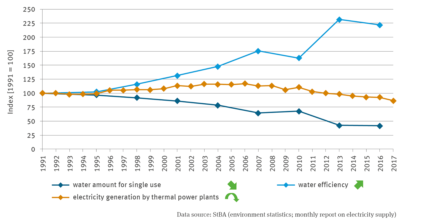 The line graph represents the amount of water for single use (with a significant decreasing trend) and water efficiency (with a significant increasing trend) from 1991 to 2016 on a scale indexed to 100 for 1991. The additionally depicted time series for electricity generation of thermal power plants, which extends to 2017, shows a quadratically decreasing trend.