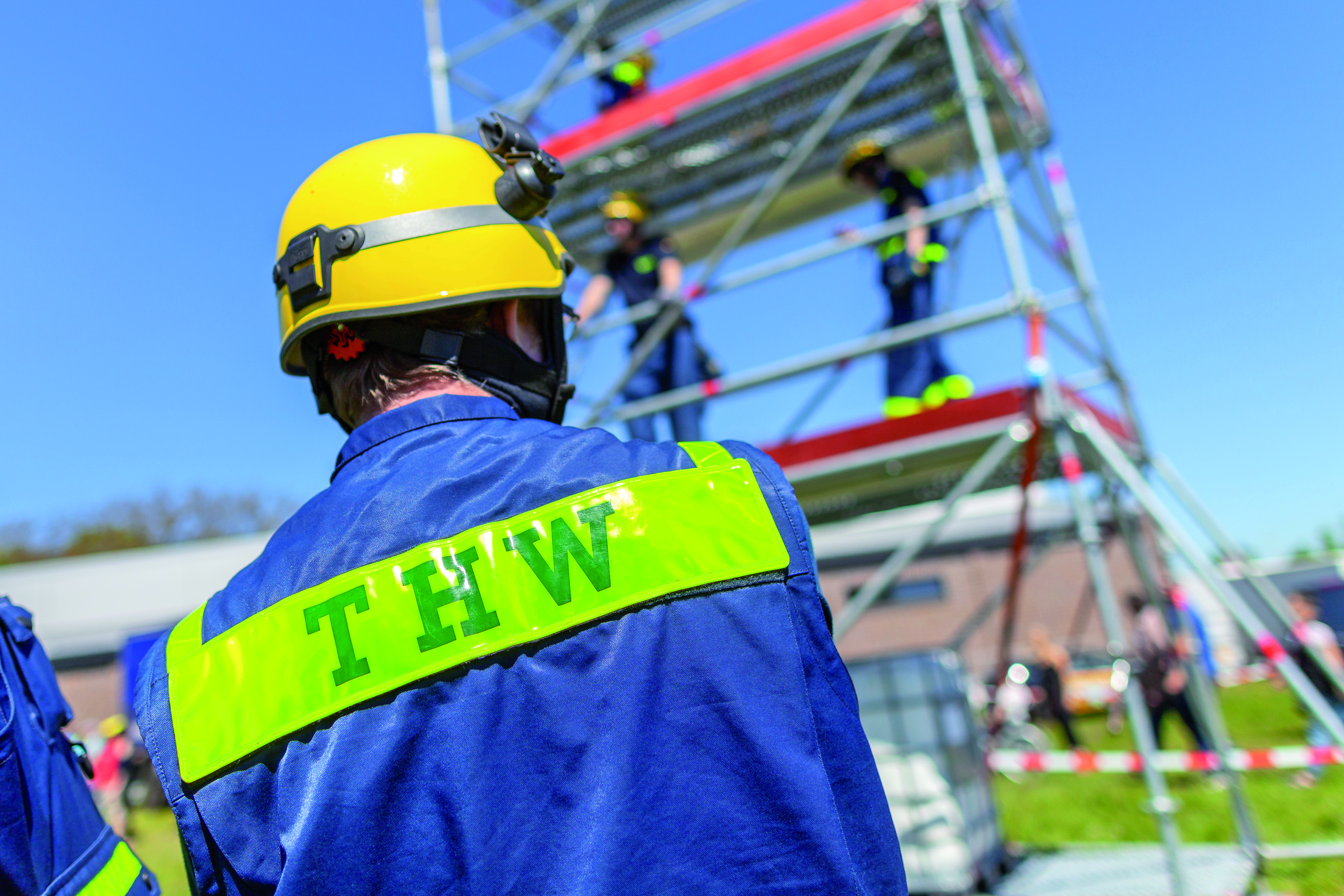 The picture shows a THW member from behind; he is in uniform and wears a helmet. It is possible to make out a scaffold with other THW members standing on it.