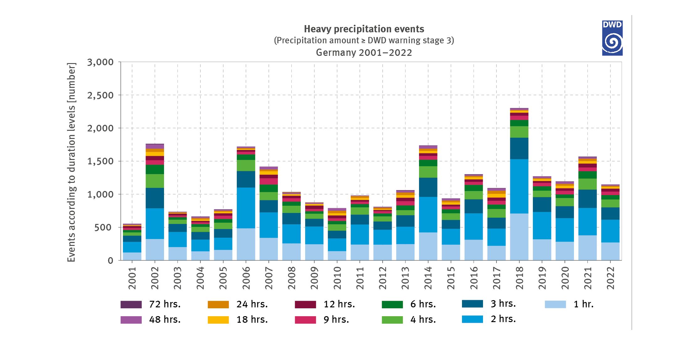 The illustration covers the period from 2001 to 2022 using stacked columns to show the annual number of heavy-rain events in Germany, differentiated by eleven duration levels – 1 hour, 2 hours, 3 hours, 4 hours, 6 hours, 9 hours, 12 hours, 18 hours, 24 hours, 48 hours and 72 hours. In this context, a heavy-rain event is an amount of precipitation which equates to DWD warning level 3 or higher. In the course of the period examined, the height of the columns increased, albeit subject to slight fluctuations