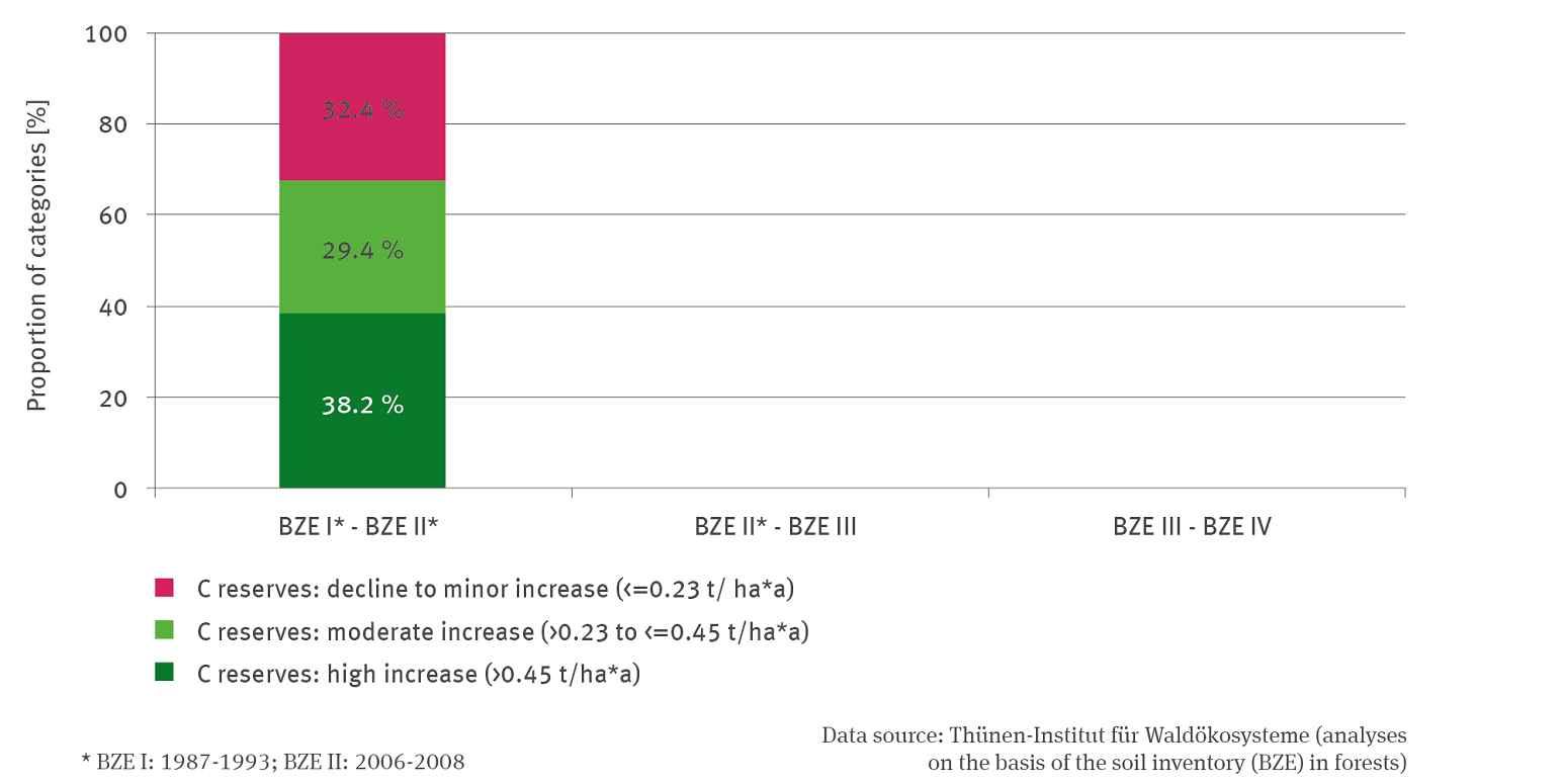 The stacking column represents changes in the stock of organic carbon between the first and second BZE. Three classes were formed: Decrease to low increase (less than or equal to 0.23 tonnes per hectare per year), moderate increase (between more than 0.23 to less than or equal to 0.45 tonnes per hectare per year) and high increase (more than 0.45 tonnes per hectare per year). For these initial evaluations, the category boundaries were set so that each class has a share of about one third.