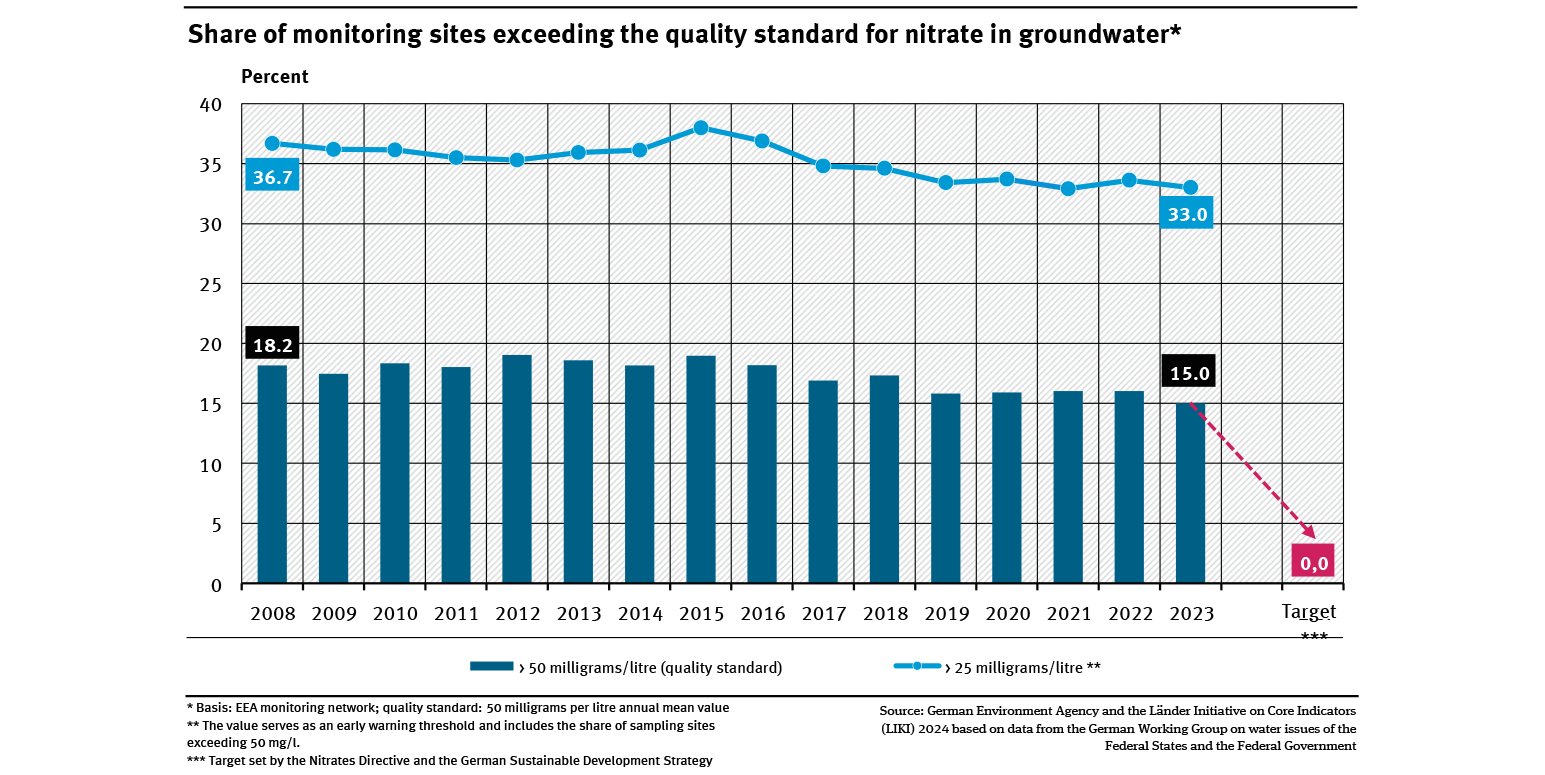 A graph shows the proportion of groundwater sampling sites where nitrate measurements for the years 2008 to 2023 were above 25 and 50 milligrams per litre. In the period covered, neither sub-indicator has shown any significant change.