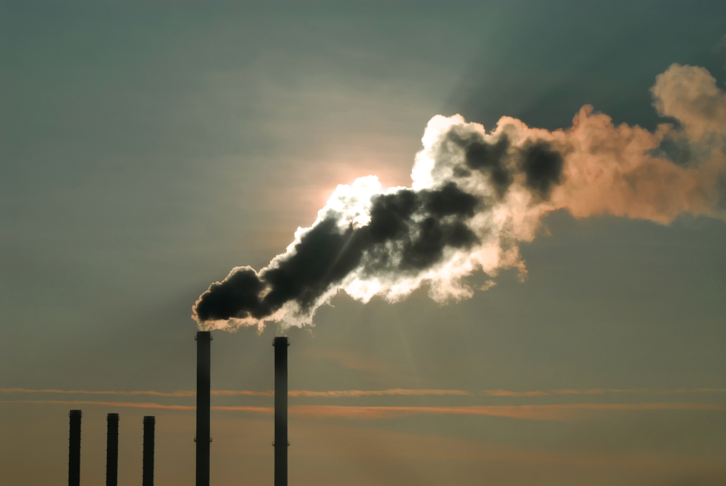 Smoke from chimney blocking the sun, hazy grey sky in background