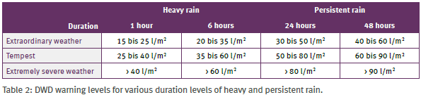 Table 2: DWD warning levels for various duration levels of heavy and persistent rain