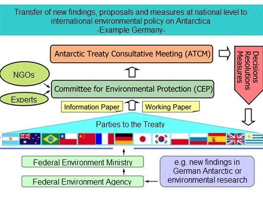 Umsetzung neuer Erkenntnisse, Vorstellungen oder Maßnahmen von der nationalen Ebene in die allgemeine antarktische Umweltschutzpolitik