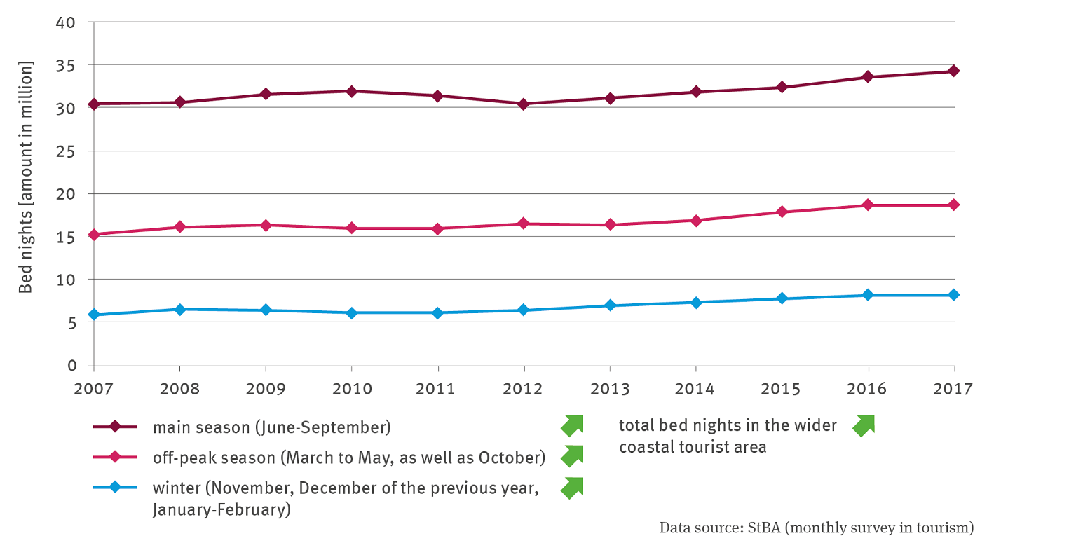 The line graph shows the number of overnight stays in millions, differentiated for the main season from June to September, for the low season from March to May and October, and for winter from November to December of the previous year and January to February of the respective year. The time series ranges from 2007 to 2017. In all three cases, no trend emerges. In the high season, the numbers range between 30 and 35 million, in the low season between 15 and 20 and in winter between 5 and 10 million.