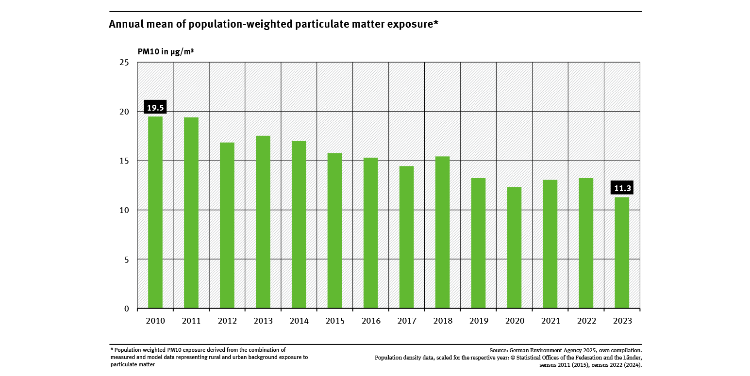 Over the observed period, there has been a general downward trend in population exposure to particulate matter in Germany: in 2010, the indicator value was 19.5 µg/m³, whereas in 2023 it had dropped to 11.3 µg/m³. This corresponds to a reduction of approximately 42 %.