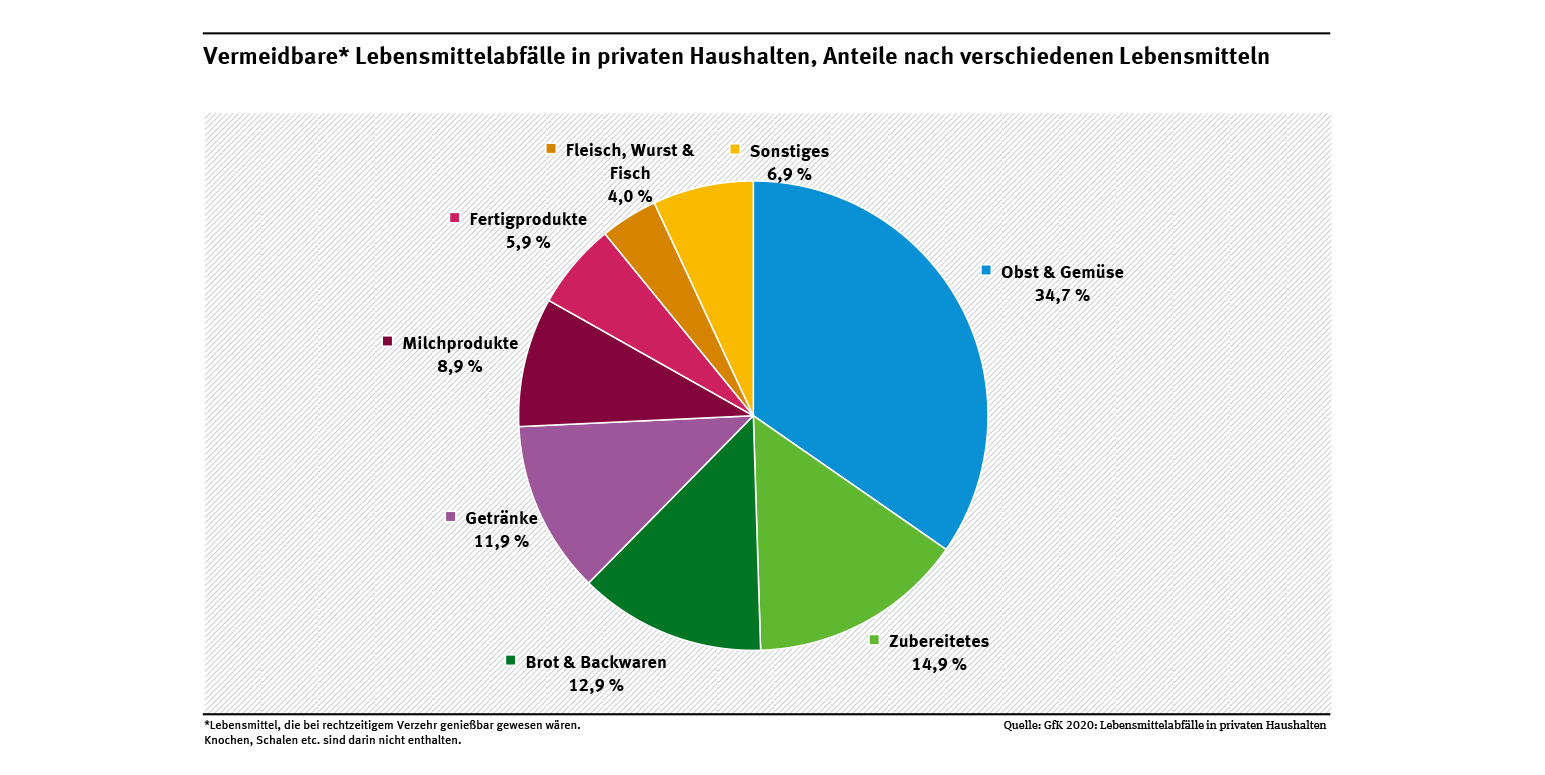 Diagramm: Jedes Jahr werden in Deutschland rund 22 kg vermeidbare Lebensmittel weggeworfen. Davon sind ein Drittel Obst und Gemüse, 15 Prozent Zubereitetes und 13 Prozent Backwaren. Vermeidbare Lebensmittelabfälle in privaten Haushalten, Anteile nach verschiedenen Lebensmitteln
