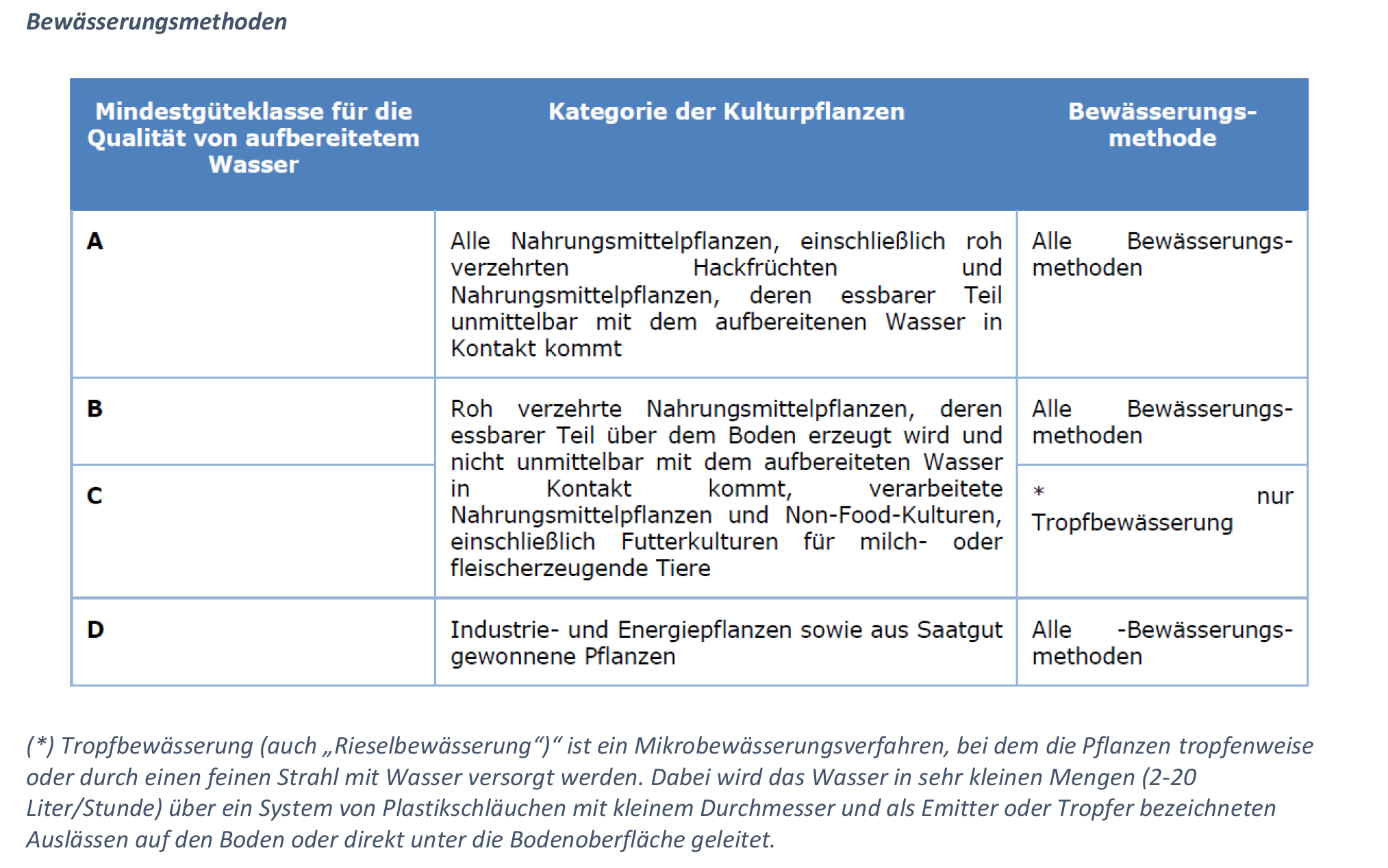 Tabellen zum Verordnungsvorschlag: Güteklassen und Mindestanforderungen für die Qualität von aufbereitetem Wasser