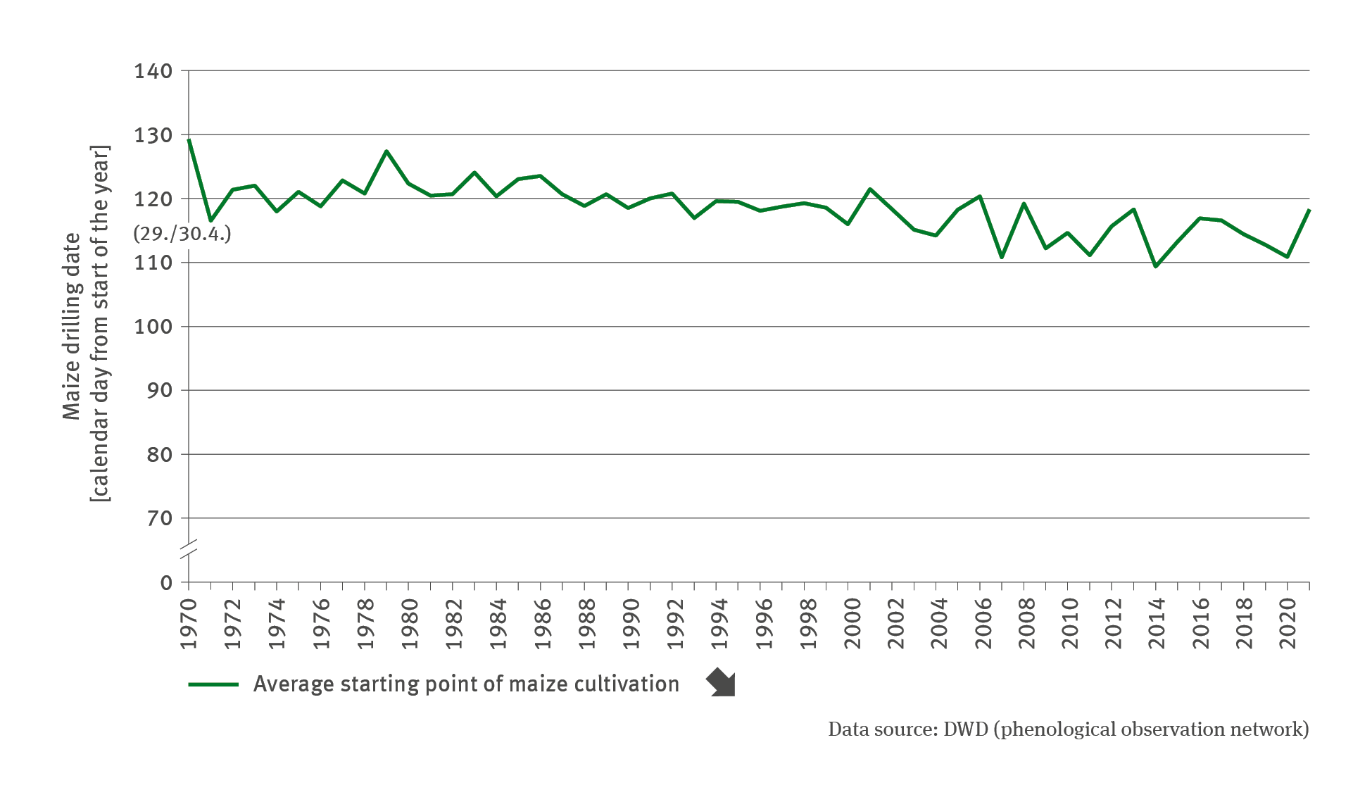 The cultivation of maize takes place typically in the course of April and May once the soil is warm, well dried and resilient, while the soil temperature amounts to roughly 8 to 10 °C. Sowing at the right moment is crucial for plant development, healthy growth and thus ultimately also for yields. In spring any effects due to management operations will be comparatively minor, and the influence of weather patterns play a more important role at that time, rather than at a time when management operations are scheduled for summer and autumn. Therefore the changes regarding cultivation dates in spring are a suitable subject for indication in the context of climate change, especially for summer crops.