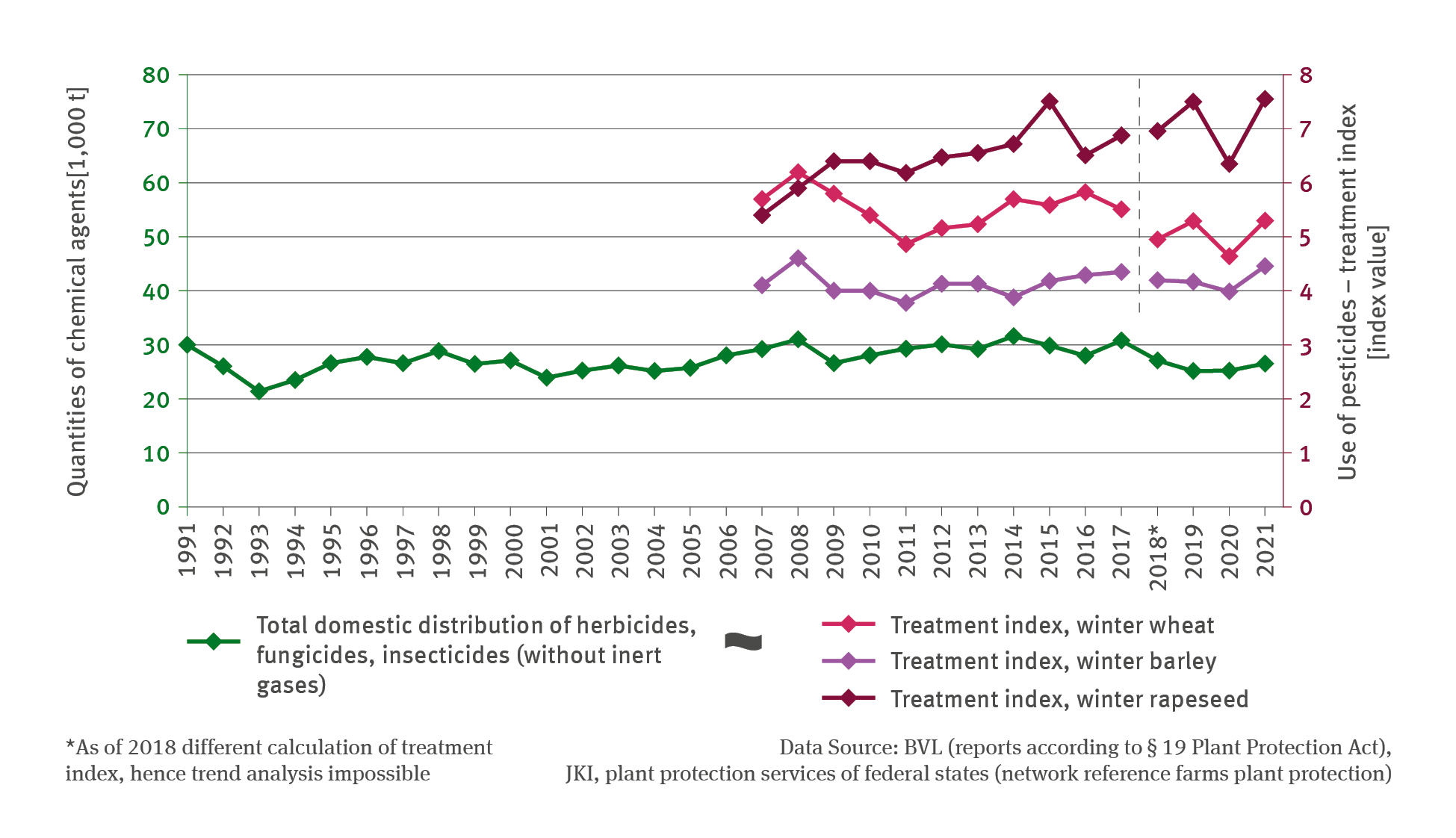 In 2018 a methodological modification took place regarding the calculation of the treatment index. As a result of this modification, the indicator now calculates the intensity of the pesticide application in more detail. This adjustment caused a break in the time series which makes it currently impossible to provide a trend analysis. Besides, it is generally difficult to carry out trend interpretations in this context, as there are multiple factors of influence to be taken into account, alongside the weather