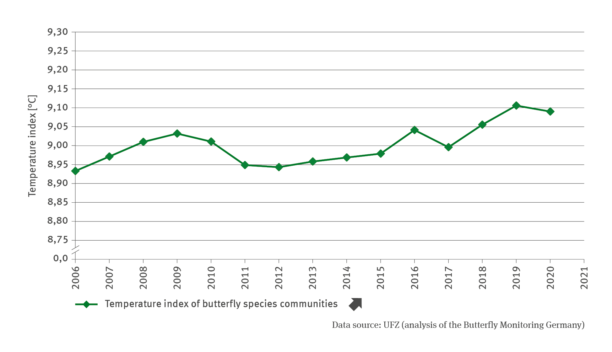 In order to calculate the temperature index of butterfly communities, it was necessary to first calculate the mean temperature requirement value per butterfly species, which was derived from the average temperature prevailing in the European distribution range of the species within the reference period from 1971 to 2000. Subsequently, the mean was calculated for the index by weighting the species-specific temperature values according to each species’ frequency of occurrence. The input contained data for 71 frequent and semi-frequent butterfly species as recorded within the transects used by Butterfly Monitoring (Tagfalter-Monitoring) for Germany as a whole. An annual temperature index for the butterfly communities was calculated for each transect and used as a basis for calculating the mean value for Germany. An index value increasing over time illustrates a shift in frequencies in favour of thermophilic species.