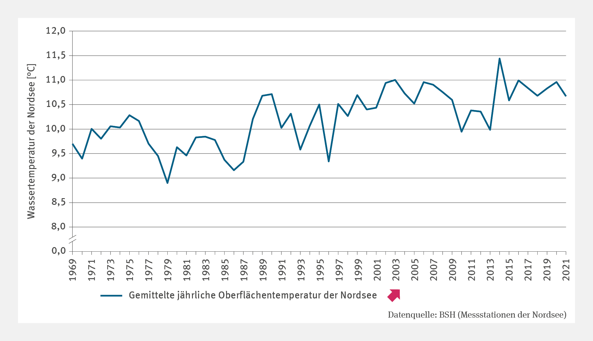 The highest annual mean temperatures of the North Sea so far – typically resulting from extreme warming in the summer months – amounted to 11.0 °C (2003, 2006, 2016, 2020) and above (11.4 °C, 2014), and latterly 11.2 °C (in 2022).