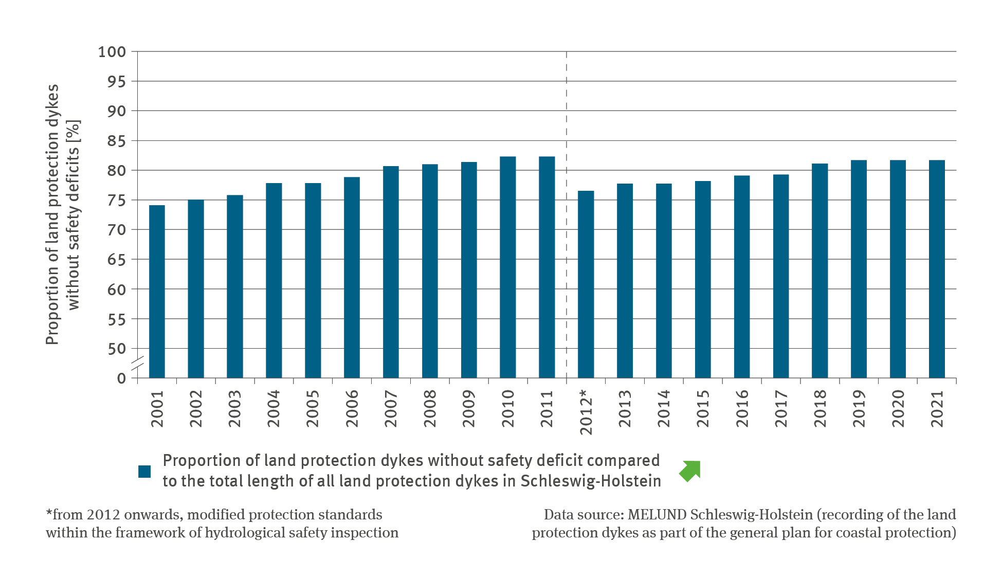 The indicator shows the percentual proportion of land protection dykes without safety deficit compared to the total length of all land protection dykes in Schleswig-Holstein. The indicator thus reflects the current condition of land protection dykes with reference to the hydrological loads imposed by storm surges. At present, 81.7 % of land protection dykes do not show any safety deficits. This is a higher proportion than the value of 76.5 % determined by the previous safety inspection in 2011. Nevertheless, as a result of the severe storm surge known as Xaver in 2014, a 5.6 kilometre stretch of the dyke line was additionally categorised as unsafe. The strong decline in 2012 is due to the hydrological safety inspection in 2011 of land protection dykes based on a higher safety criterion applied than in 2001 (annual probability of 0.5 % instead of 1.0 %). This was the main reason for extending the length of dykes to be reinforced from 72.7 kilometres again to a total of 101.5 kilometres which equates to 23.5 %.