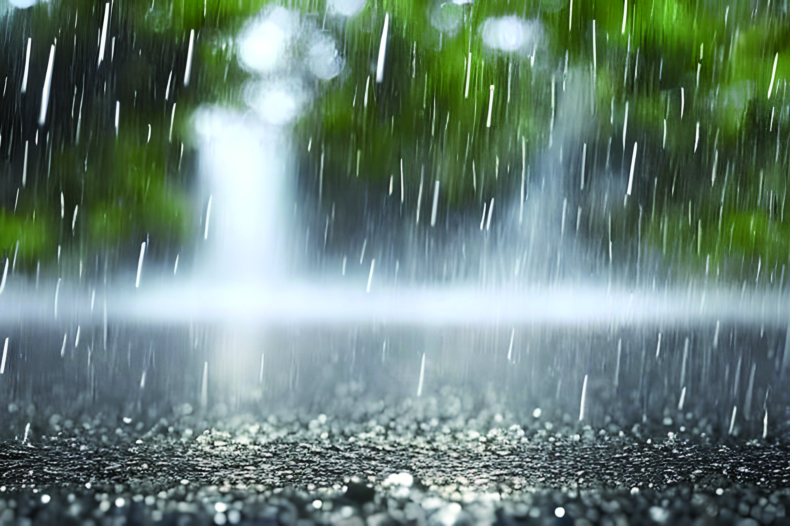 The picture shows rain falling on a tarmac surface. In the background, it is possible to make out a fuzzy image of vegetation. State: Extreme events – heavy rain