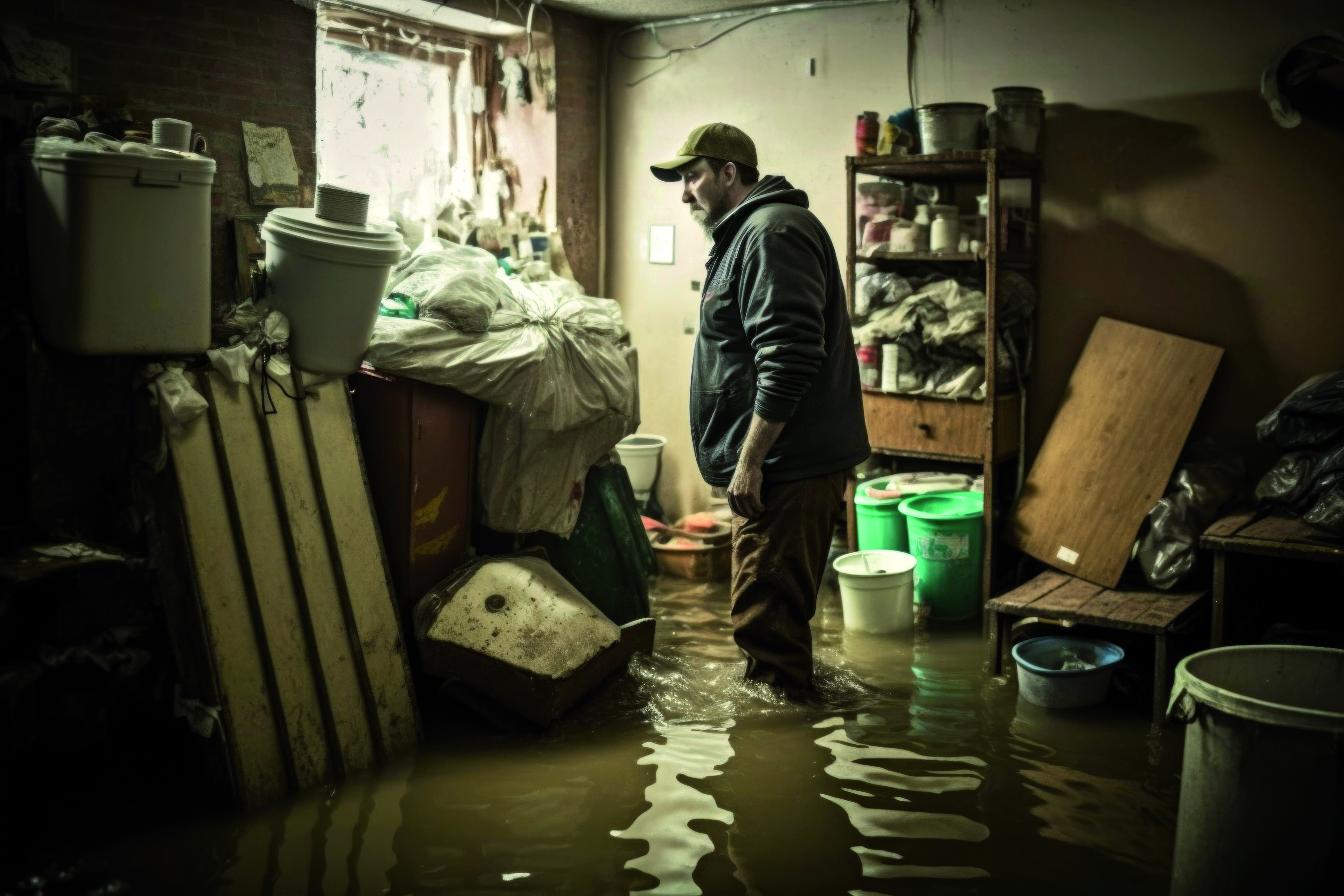 The picture shows a man standing in a flooded cellar, kneedeep in brown water. There are tins, cartons and flowerpots visible on a rack of shelves. Some synthetic buckets are standing in front of this rack with floodwater lapping round them. The man is looking at additional containers, pallets and synthetic bags piled up in front of him. Response: FiW-R-1 Public awareness of storm and flooding risks