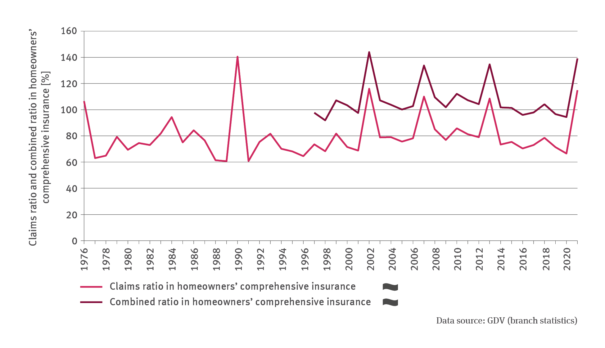Whether an insurance segment is profitable is indicated by the so-called combined ratio. The storm events of recent years left their mark on the combined ratio of homeowners’ insurance. Where the ratio exceeds 100 %, this signifies that this is a loss-making business for the insurance company. In the segment of homeowners’ comprehensive insurance, the combined ratio is usually comparatively high. This regularly causes actuarial losses incurred by insurance companies. The data collected by insurance companies have been collated centrally for the past 25 years. Looking back at this period of time, it becomes evident that up to 2015, German insurance companies managed to make an actuarial profit only in three years (1997, 1998 and 2001) as far as the homeowners’ comprehensive insurance segment is concerned. Between 2002 and 2014 the insurers of homeowners’ properties accumulated an actuarial minus of more than 7 billion Euros. For a long time the competition on price in the field of homeowners’ comprehensive insurance was very keen, which made insurance companies hesitant to adapt the calculation of the premiums charged by them. Since the end of the price war over homeowners’ insurance and the resulting increase in premiums, the combined ratio for 2016 and 2017 as well as 2019 and 2020 reverted to below 100 %. Consequently, in those years it was possible again to achieve an actuarial profit in the field of homeowners’ comprehensive insurance. However, the severe damage year of 2021 disrupted this positive development very suddenly. So far it has not been possible to identify a statistically significant trend in respect of the combined ratio.