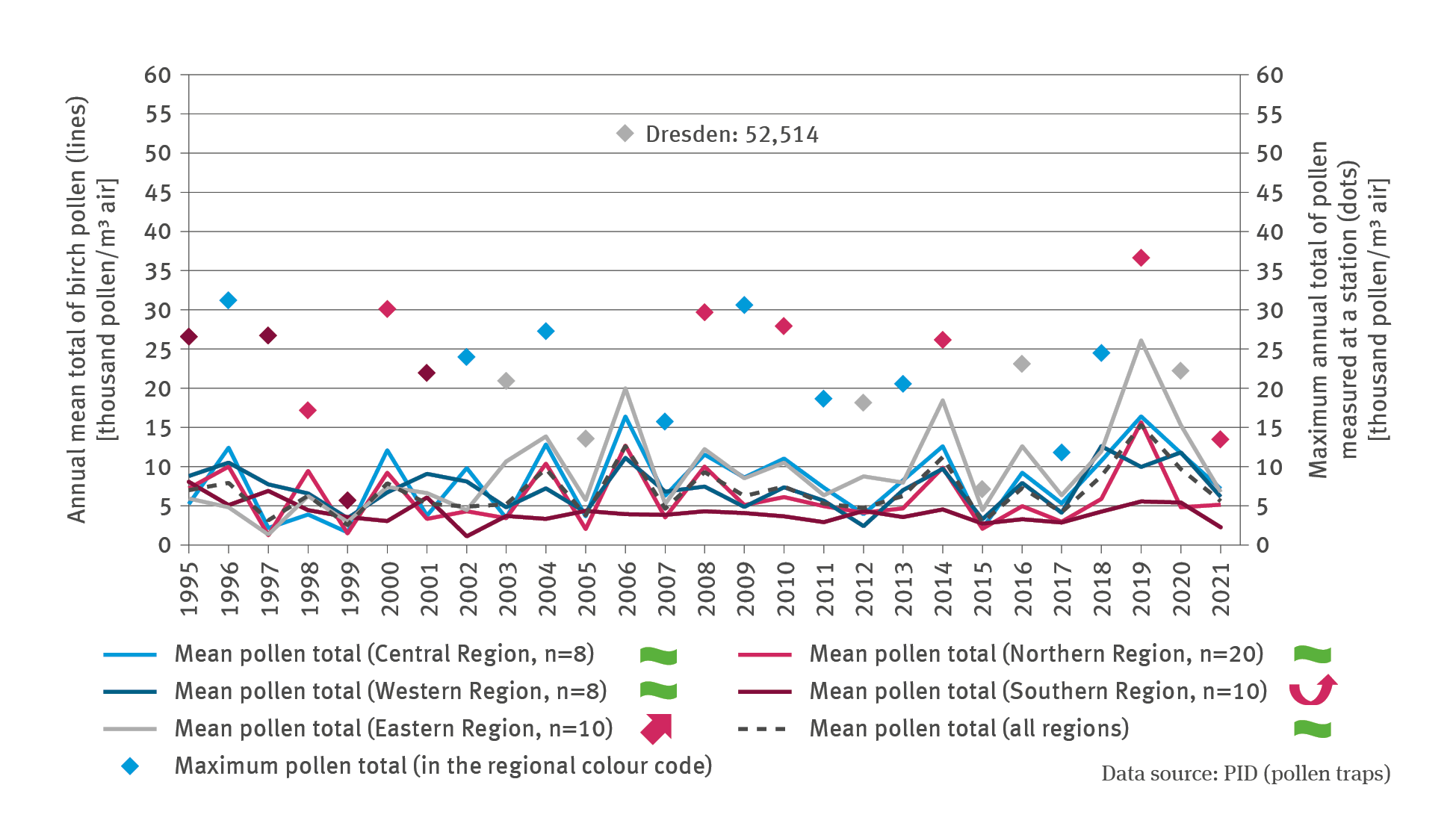 GE-I-3 ’Birch pollen burdens’ contains a biaxial chart. For the years from 1995 to 2021, the lines show the annual mean total of birch pollen in thousand pollen per cubic metre air. A differentiation is made between the central, northern, eastern, southern and western regions. In addition, the mean pollen total across all regions is illustrated. The curves fluctuate between 2 and 20 thousand pollen per cubic metre air. GE-I-3: Birch pollen burdens