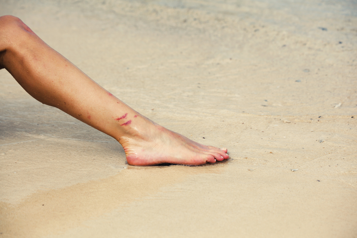 The picture shows an outstretched foot on a sandy beach. There are two abrasions visible above the ankle.