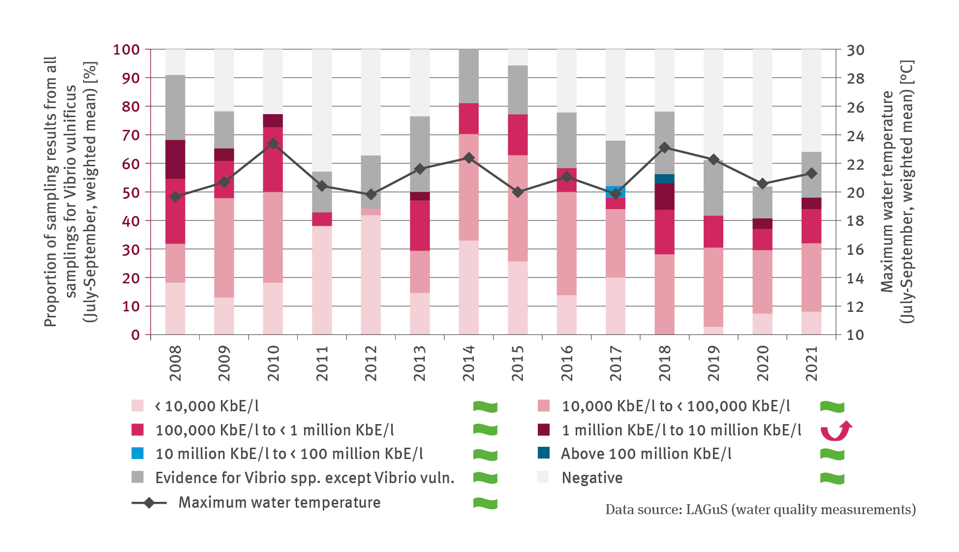 It is mostly through open wounds that vibrios enter the human body. They are less frequently absorbed through inadvertent swallowing of infested water or the ingestion of contaminated shellfish or fish. Subject to the type of pathogen, an infection can present in different ways. Apart from causing diarrhoea and stomach aches, the infection can damage a person’s health, for instance through body tissue dying (necroses) and in severe cases to an infection of the blood flow (sepsis), sometimes even leading to a person’s death. The infection risk increases as a function of the increase in vibrio concentrations in the water. However, the absorption of vibrios does not always trigger an infection. The underlying health condition of a person also influences the risk and severity of the infection. The chronically sick, immune-deficient and elderly people are particularly at risk. In 2018 and 2019 there were eight mortalities among these groups of people, that were associated with vibrios30.