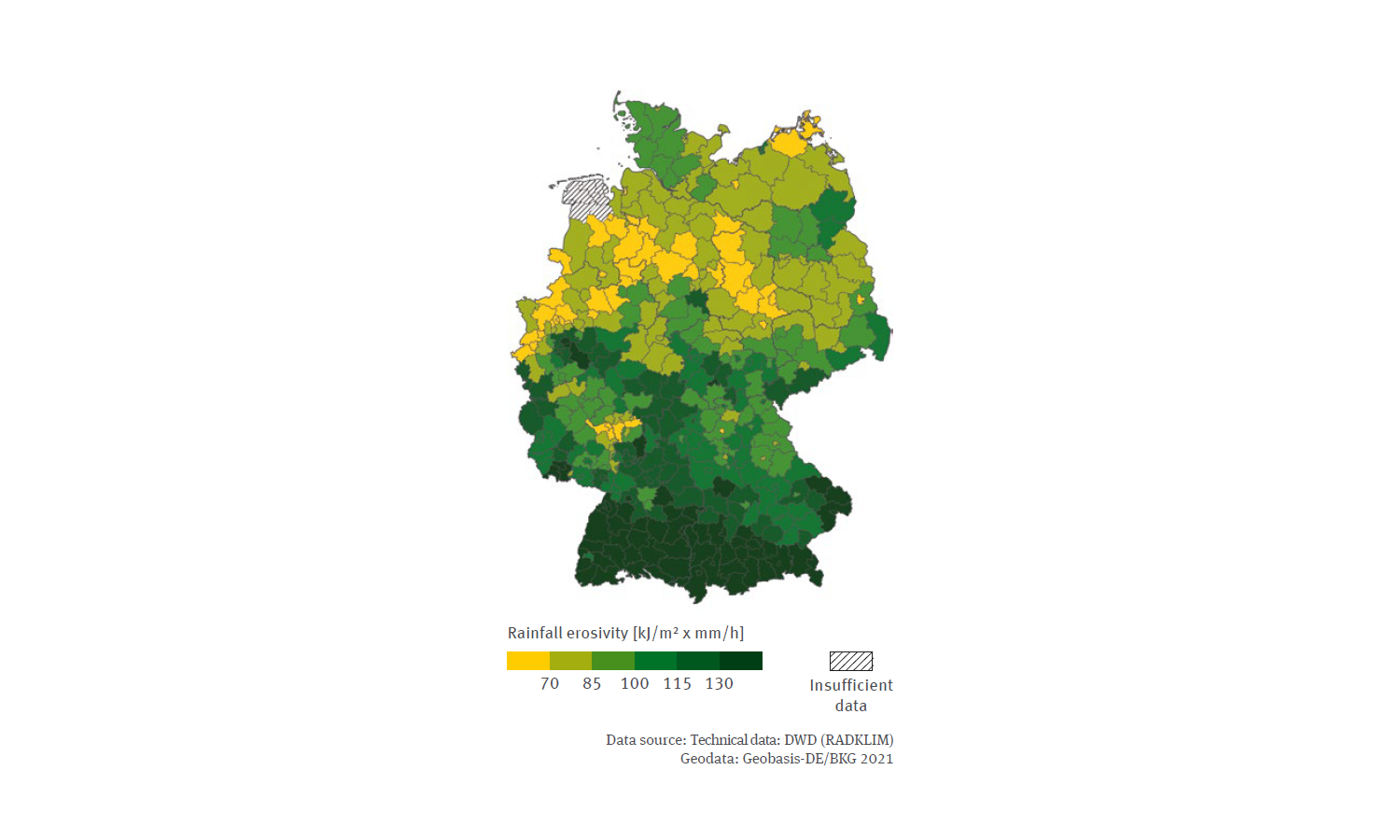 In Germany, rainfall erosivity is essentially in line with the distribution of precipitation. As far as the mean of 2017 to 2021 is concerned, the lowest R-values (RADKLIM radar data) were centred on Saxony-Anhalt and Lower Saxony, on North Rhine-Westphalia and on the coast of Mecklenburg-Western Pomerania. In the North German Plain, erosive precipitation volumes generally occur less frequently than in central Germany and the south of the country where, in orographical terms, the topography is more differentiated thus favouring elevating and convective processes in the atmosphere. Accordingly, the highest R-factor values occur in the ridges of upland areas and in the Alpine region.