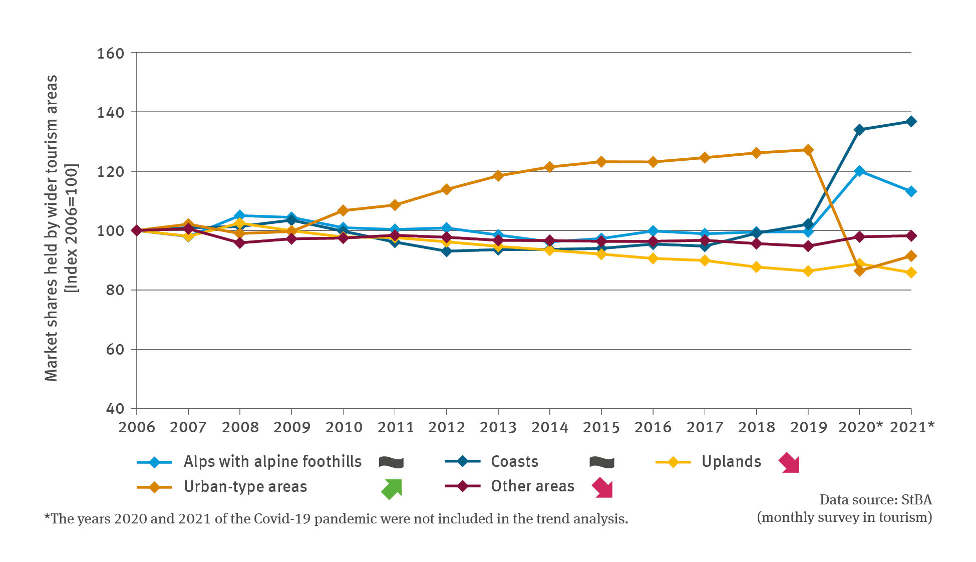 The development of market shares in the period from 2006 to 2019 is characterised – with a strong overall increase in Germany from roughly 350 to 500 million bed-nights – by a significantly rising market share in urban areas at the expense of other areas, in particular the uplands and other areas. In 2020 and 2021, this development was disrupted – to various degrees within Germany – by travel restrictions and travel warnings issued by the German Foreign Office during the Covid-19 pandemic. These restrictions entailed that Germany’s population overall undertook distinctly less holiday travel and if they travelled at all, they only visited domestic destinations. Moreover, the number of bed-nights from foreign visitors – amounting to some 90 million in 2019 – decreased to 32 million visitors in 2020.209 Overall in Germany, the demand dropped to roughly 300 million bed-nights, in other words it fell distinctly below the level recorded in 2006. This decline generally affected all wider tourism areas, but in particular the urban-type areas where – owing to travel restrictions – there were hardly any international visitors, while trade fairs and other events just could not be held. In this field, bed-nights declined by almost 60 %. The decline was lowest in the wider coastal tourism areas amounting to -20 %. Evidently, the destinations on North Sea and Baltic Sea coasts benefited from the widespread German predilection for beach vacations.
