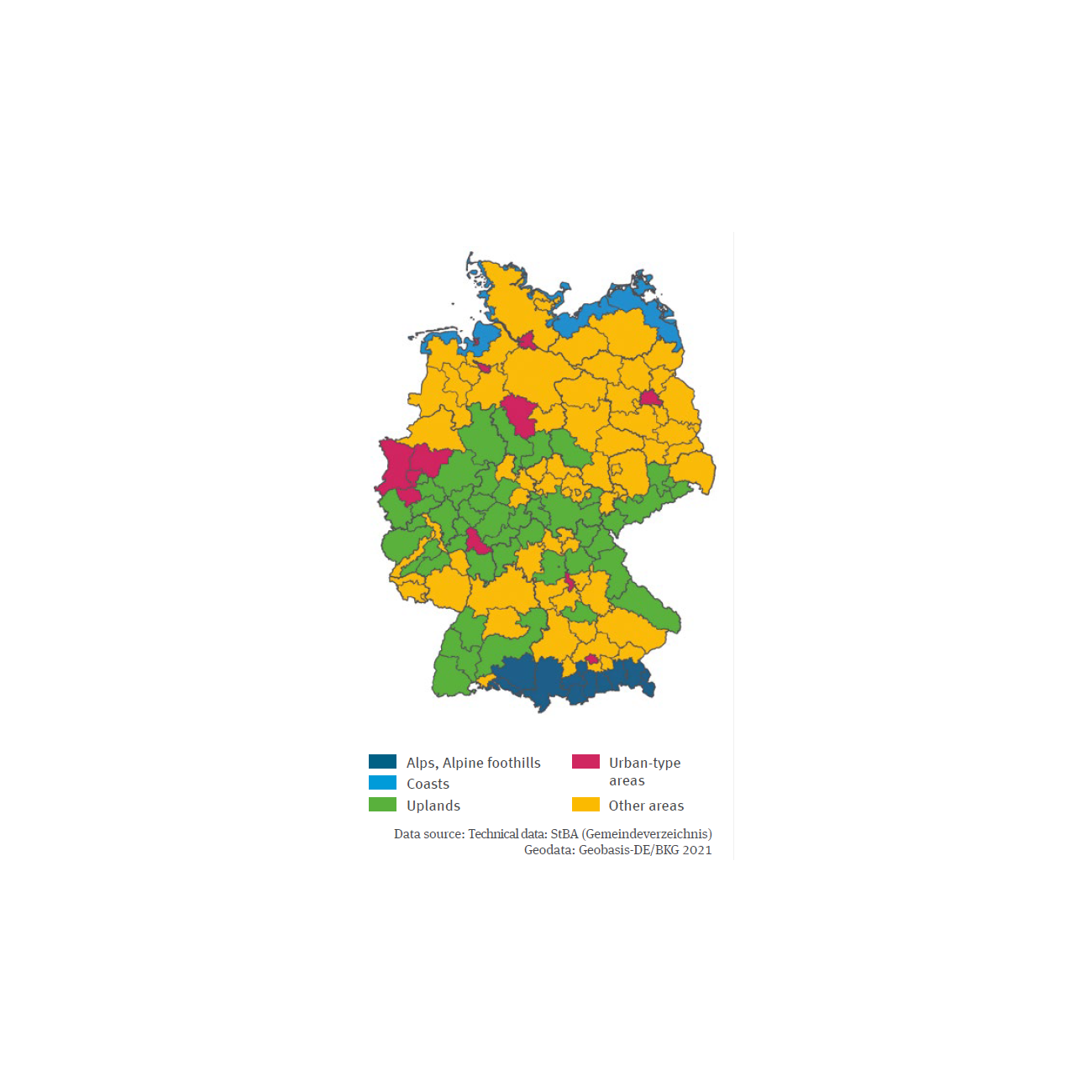 Any changes in the attractiveness of wider tourism areas – owing to gradual or acute climate change impacts – can in turn affect market shares. Against this background, the indicator for wider tourism areas entitled ‘Alps with alpine foothills’, ‘Coasts’, ‘Uplands’, ‘Urban-type areas’ as well as ‘Other areas’ illustrates the development of market share in terms of occupancy rates in accommodation businesses nationwide. The indicator thus provides an easily comparable overview of the development of travel demand in the areas concerned.