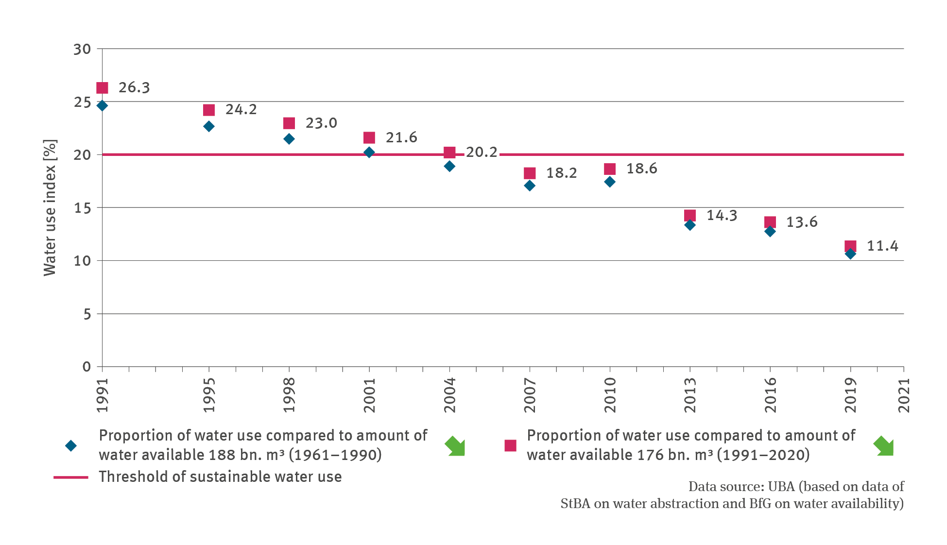 Owing to a reduction in both the commercial and private water usage in Germany, this 20 % threshold has been undercut regularly since 2004. Overall the values recorded in the water use index have been declining significantly since 1991. Hence it follows that according to internationally valid benchmarks, the extent of water usage can be considered sustainable. Energy producers as well as industrial and mining operations have contributed to this distinct reduction; as these companies clearly command the greatest share (70 %) of water usage (cf. Indicator IG-R-1). Coolant abstraction by power plants for energy generation accounted for the lion share of commercial water usage. Consequently, efficiency improvements in terms of recycling or cyclical usage, had particularly favourable effects on the water budget, at least until 2007. In view of the closure of the last remaining nuclear power plants after the April 2023 temporarily extended deadline, it is expected that cooling water abstraction by power plants will decrease further.
