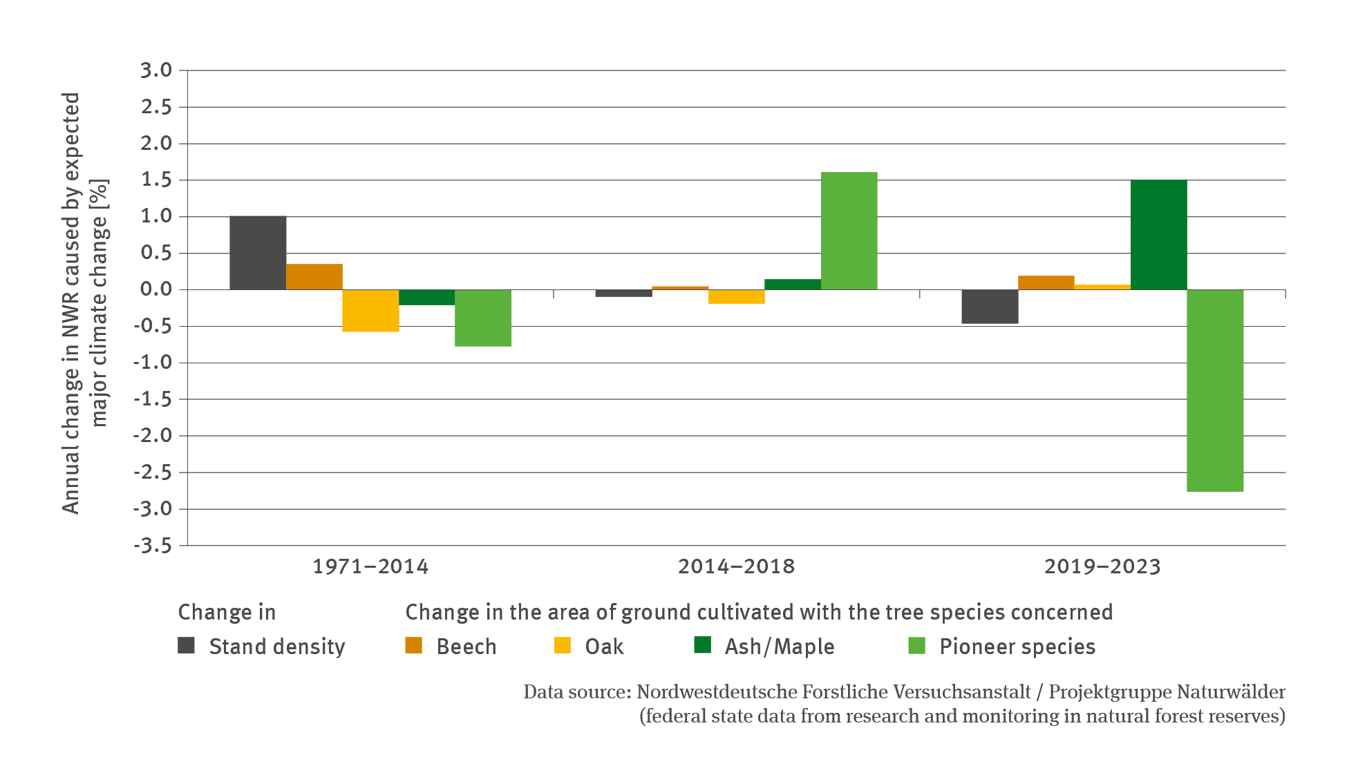 In the natural forest reserves owned by Länder such as Baden-Württemberg, Bavaria, Brandenburg, Hesse, Lower Saxony, North-Rhine Westphalia, Rhineland-Palatinate, Saxony-Anhalt and Schleswig-Holstein, there have been indications of shifts in tree species compositions up to 2014, which cannot be attributed to climate-related changes. The majority of stands are characterised by increasing density, which points to the continued predominance of vigorous trees. While beech trees were able to increase their share, the proportions of oak species and the ash / maple group had declined. This development can be explained on one hand by the competitiveness of beech trees, and on the other, by disease-related dieback affecting oak and ash trees. The group of pioneer tree species showed only negligible change. Overall, events did not indicate that developments were strongly influenced by climate change.