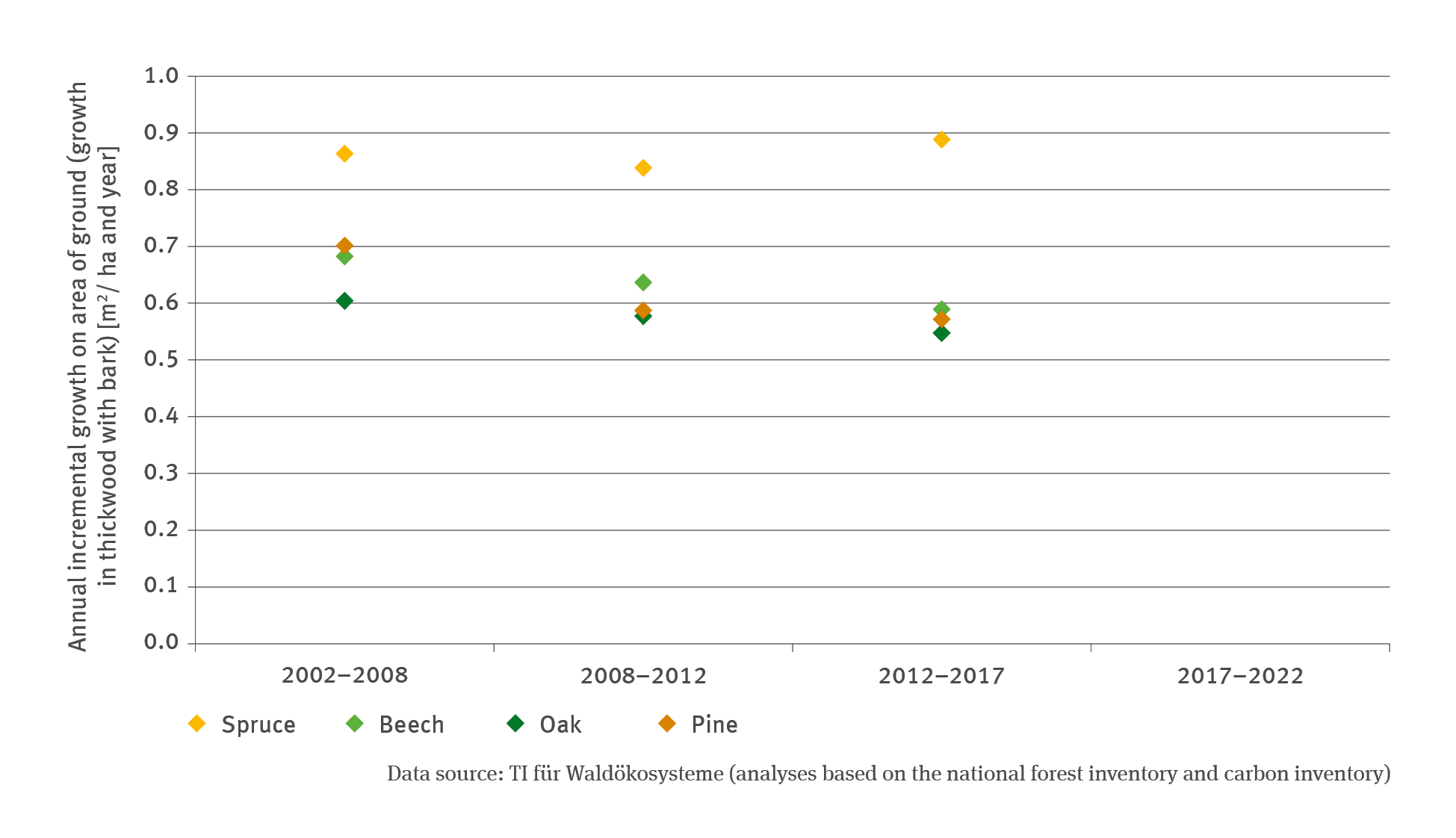 The incremental growth rates for beech, oak and pine trees have declined distinctly since 2002. It is assumed that dry years and their aftereffects on forest ecosystems have a detrimental influence on growth rates. The higher growth rate in respect of spruce stands in the period of 2012 to 2017 can probably be attributed to the fact that there were no supraregional damage events during that period and that precipitation was of average extent.