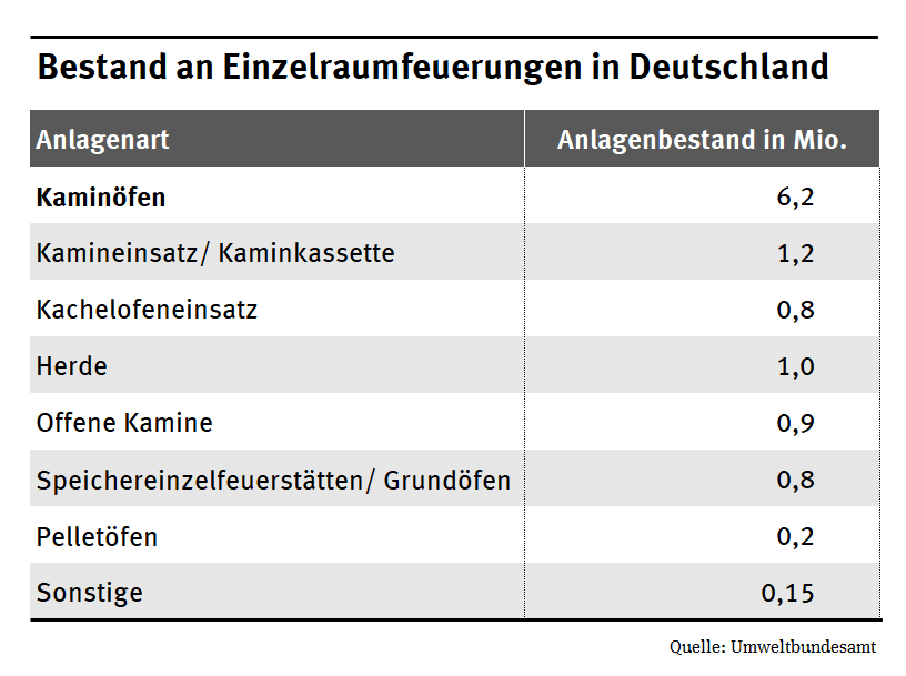 Einzelraumfeuerungsanlagen verursachen, verglichen mit anderen Wärmeerzeugern der Haushalte, die höchsten Emissionen von Feinstaub und gasförmigen Luftschadstoffen. Darüber hinaus haben Einzelraumfeuerungsanlagen verglichen mit anderen Wärmeerzeugern geringere Wirkungsgrade, was dazu führt, dass mehr Brennstoff verbrannt werden muss, um ein vergleichbares Temperaturniveau zu erreichen. Innerhalb der Anlagenkategorie der Einzelraumfeuerungsanlagen haben die offenen Kamine die höchsten Emissionen und den niedrigsten Wirkungsgrad. Bei offenen Kaminen ist der Feuerraum zum Wohnraum hin offen. Daher können Sie die Zufuhr der Verbrennungsluft nicht regeln. Offene Kamine verursachen wegen niedriger Verbrennungstemperaturen und eines zu hohen Luftüberschusses hohe Schadstoffemissionen und geben nur wenig Wärme ab. Daher dürfen diese Anlagen nur gelegentlich betrieben werden.