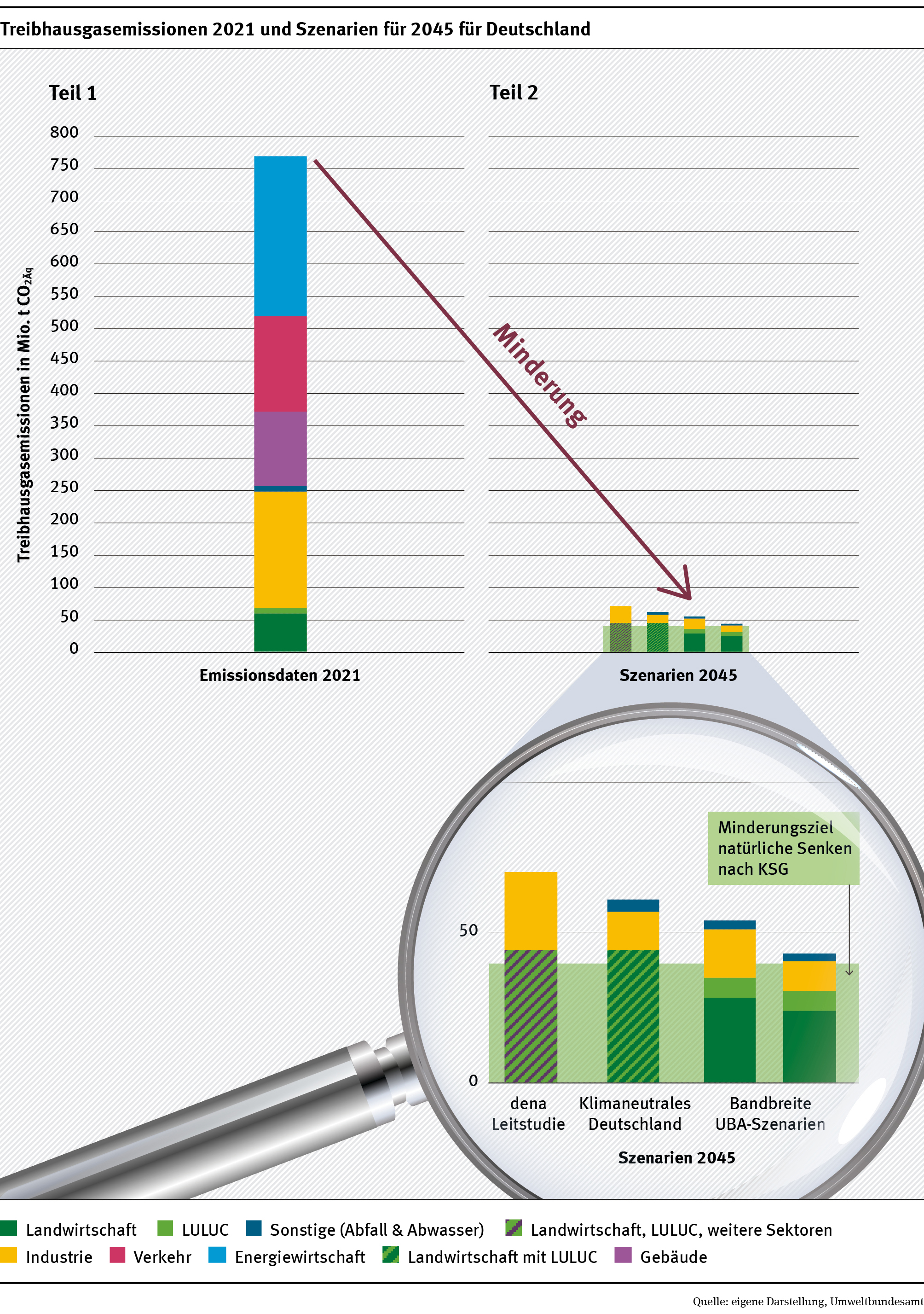 Ab dem Jahr 2045 soll nach Zielvorgaben des Bundesklimaschutzgesetzes (KSG) eine jährliche Minderungsleistung von mindestens minus 40 Millionen Tonnen CO₂ erreicht werden. Bei sehr optimistischen Annahmen würde dies in Deutschland bereits ausreichen, um die unvermeidbaren Emissionen auszugleichen. Der Bedarf an technischen Senken könnte daher sehr klein oder sogar Null sein.