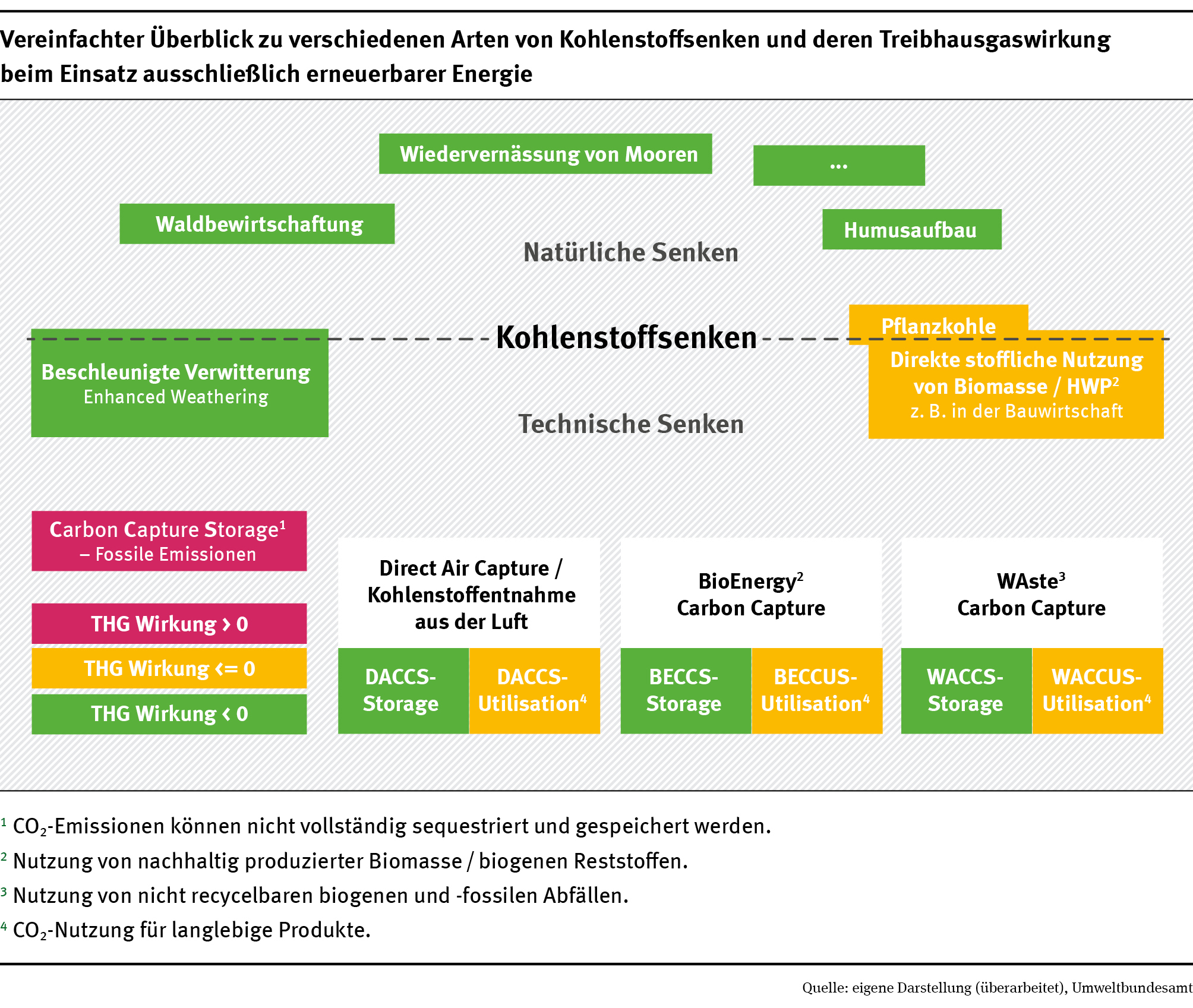 Um die Konzentration von Treibhausgasen in der Atmosphäre zu vermindern oder Treibhausgase zurückzuhalten, sollten vorrangig und ambitioniert natürliche Senken genutzt, geschützt und ausgebaut werden, da sie statt mit Risiken sogar mit einem Mehrwert für Mensch und Umwelt verbunden sind.
