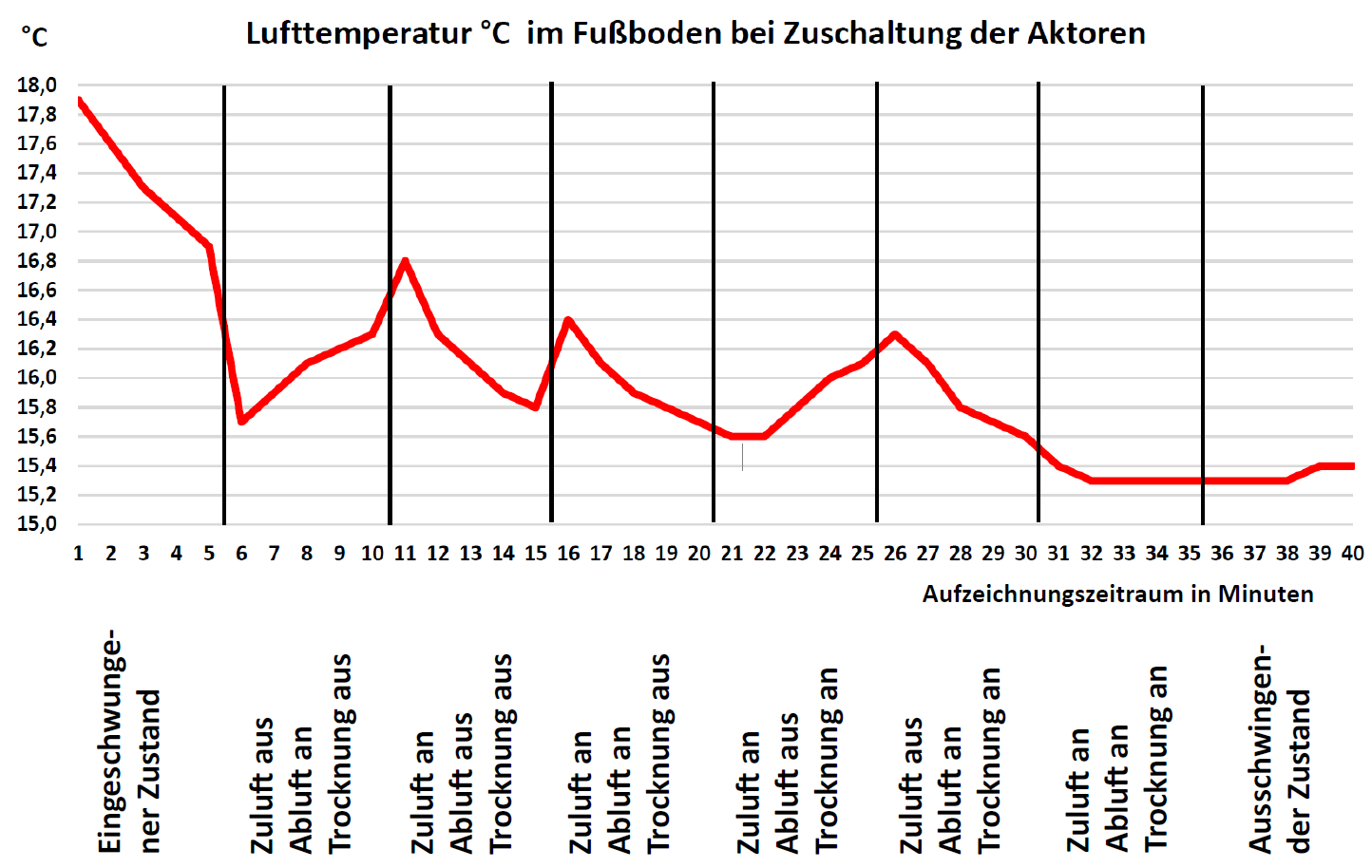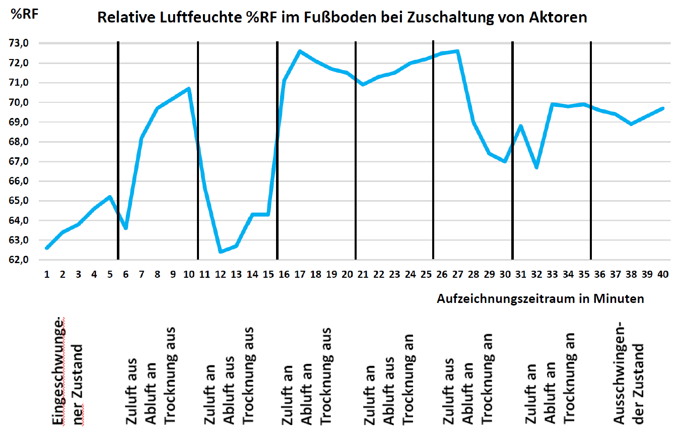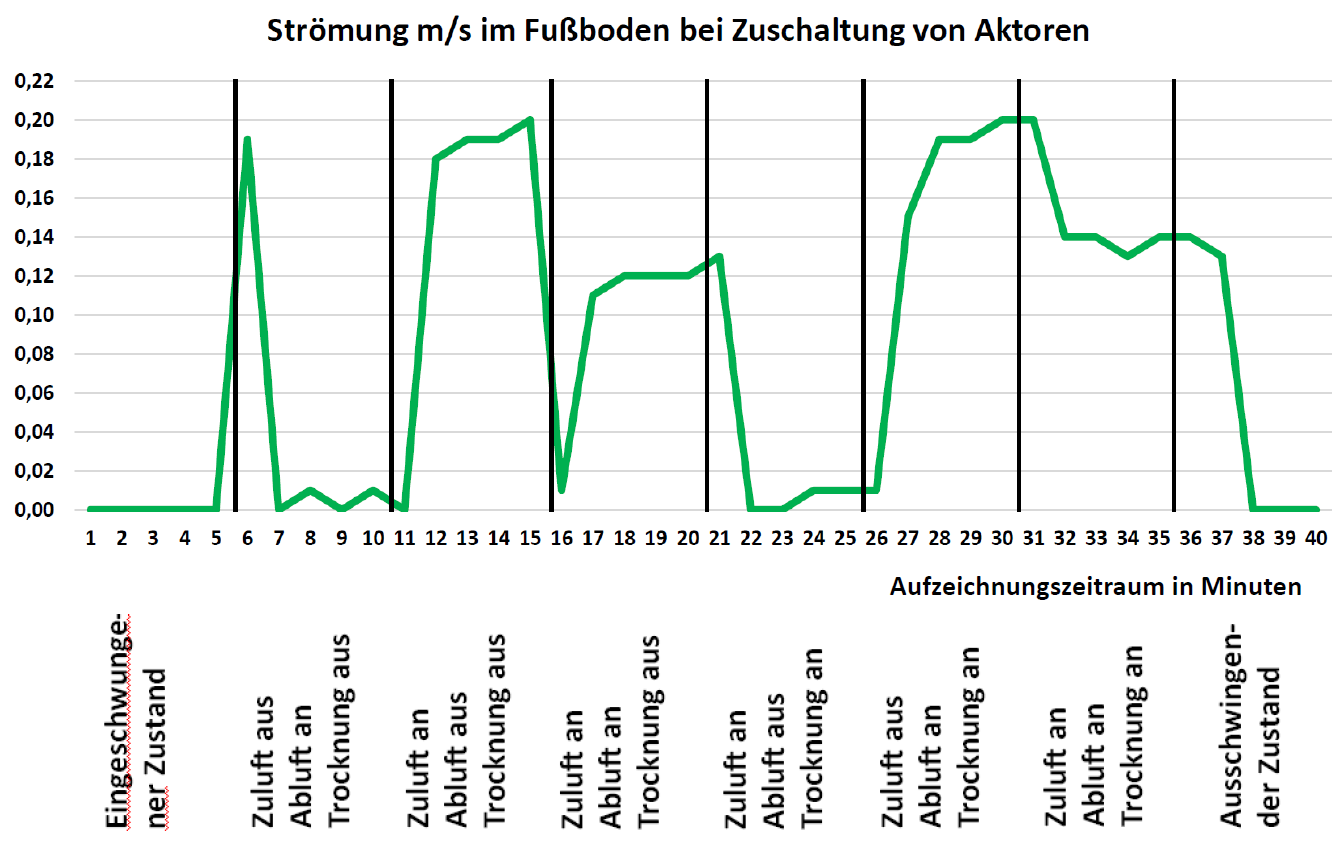 Die Reaktion im Luftspalt des Fußbodens wurde deshalb am 15.12.2023 überprüft. In einer Abfolge verschiedener Regime der Zu- und Abschaltung der Aktoren wurden Temperatur, relative Feuchte und Strömungsgeschwindigkeit in der Spaltluft des Fußbodens aufgezeichnet. Die Ergebnisse des Einflusses der Aktoren sind in den Abbildungen 9 bis 11 dokumentiert.