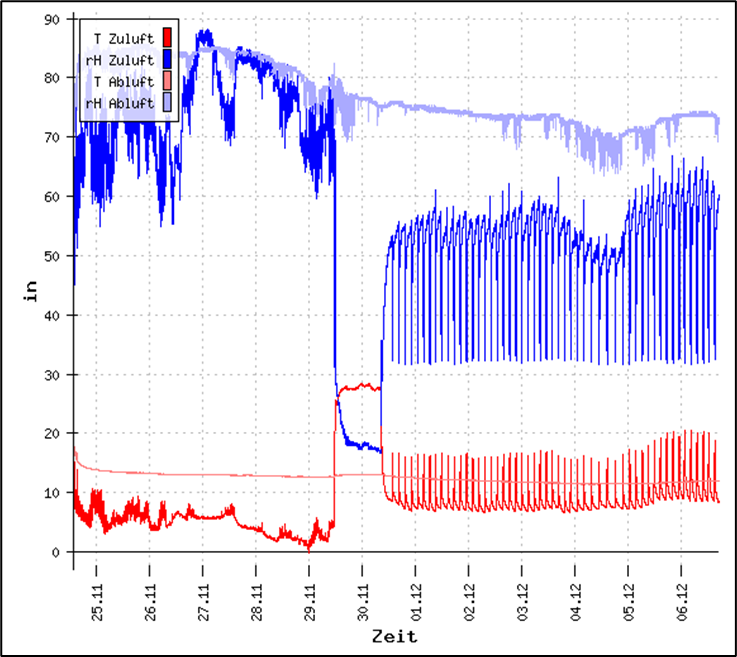 Entsprechend der geplanten Testszenarien wurde am 29.11.2023 der Zuluft-Trockner mit voller Leistung zugeschaltet und am 30.11.2023 die Leistung auf 50 % reduziert. Abbildung 7 zeigt, wie der Feuchtewert im Zuluftflansch zunächst auf < 20 % rF gesenkt wurde und sich dann intermittierend auf einen Wert um 50 % rF einpegelt. Die Erwärmung der Zuluft ist auf die Abwärme des Trockners zurückzuführen.