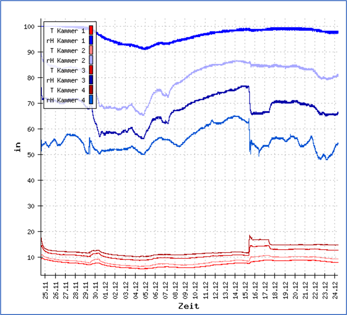 Entsprechend der geplanten Testszenarien wurde am 29.11.2023 der Zuluft-Trockner mit voller Leistung zugeschaltet und am 30.11.2023 die Leistung auf 50 % reduziert. Abbildung 7 zeigt, wie der Feuchtewert im Zuluftflansch zunächst auf < 20 % rF gesenkt wurde und sich dann intermittierend auf einen Wert um 50 % rF einpegelt. DDie Werte der Außenwand des Archivs werden im Abbildung 8 gezeigt. Damit wird das Mauerwerk innen in 5 cm Tiefe (Kammer 1), der Spalt an der Kellermauer (Kammer 2), der Spalt an der inneren Trockenbauwand (Kammer 3), die Grenzfläche zum Innenraum (Kammer 4) sowie der Innenraum selbst (Archiv) kontrolliert. Hier wird die permanente Temperatur- und Feuchtespreizung an den Messstellen des Doppelspaltsystems deutlich. ie Erwärmung der Zuluft ist auf die Abwärme des Trockners zurückzuführen.