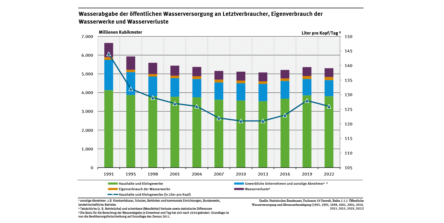 Die verbleibende Menge von zirka 862 Mio. m³ lieferten die Wasserversorgungsunternehmen an Schulen, Behörden, Krankenhäuser und an größere gewerbliche Unternehmen. Einen geringen Teil des Trinkwassers benötigten die Wasserversorger selbst, bspw. zur Spülung von Filtern oder Leitung, oder es ging Wasser durch Rohrbrüche, Havarien oder unkontrollierte Entnahmen verloren (siehe Abb. „Wasserabgabe der öffentlichen Wasserversorgung an Letztverbraucher, Eigenverbrauch der Wasserwerke und Wasserverluste“).